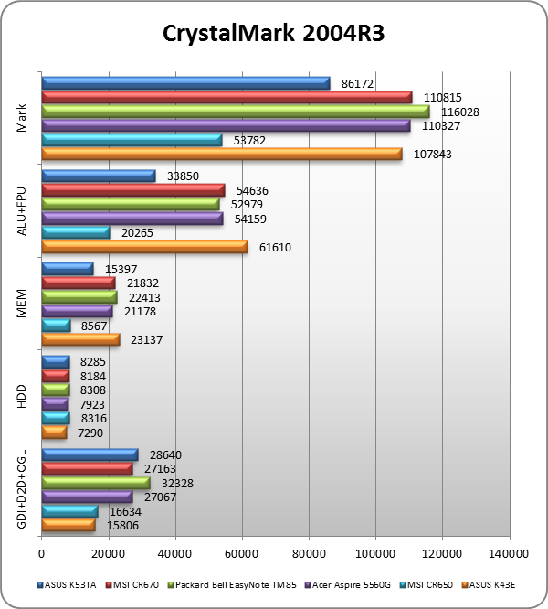 Работу ноутбука в автономном режиме обеспечивает 6-элементный литиево-ионный аккумулятор емкостью 5200 мАч (56 Вт*ч). В режиме «классический» при максимальной яркости дисплея ноутбук проработал чуть более полутора часов (98 минут). В режиме простоя при минимальной яркости дисплея время работы ноутбука увеличилось почти до семи часов (405 минут). Также стоит отметить, что при просмотре Full HD видео с максимальной яркостью дисплея ноутбук выключился через три часа (179 минут). Для восстановления полной емкости аккумулятора требуется порядка двух с половиной часов (151 минута). Итоги Обладая приятным внешним и видом и достаточно высокой производительностью, ноутбук ASUS K53TA может стать отличным помощником любому пользователю, независимо от его рода деятельности. Возможностей ноутбука вполне достаточно не только для работы с офисными приложениями и различными медиа данными, но и для комфортного времяпровождения за современными играми при не самых «тяжелых» настройках графики. Конечно, постоянно носить данную модель вряд ли получится, вследствие относительно большого веса, но в случае необходимости этот ноутбук способен обеспечить до семи часов автономной работы. Достоинства: