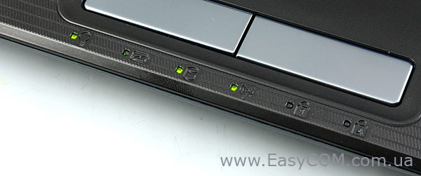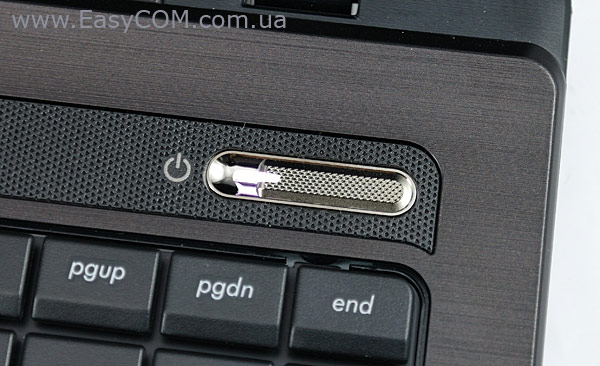 Над клавиатурой, помимо декоративной металлической сеточки, прикрывающей встроенные стереодинамики Altec Lansing Speakers, расположена продолговатая клавиша включения, оснащенная весьма яркой подсветкой белого цвета, которая в темное время суток может несколько отвлекать внимание. Каких-либо дополнительных клавиш в ноутбуке не предусмотрено.