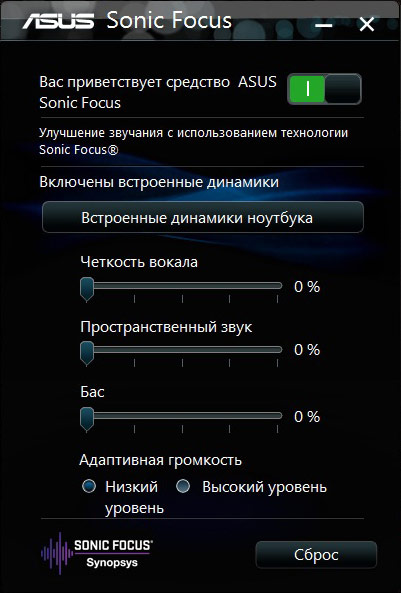 Технология ASUS Sonic Focus, разработанная совместно с компанией Synopsys, Inc., предназначена для обеспечения расширенного звучания встроенной акустики. С ее помощью можно усилить четкость вокала, добавить пространственные эффекты или увеличить глубину баса. В качестве аудиокодека используется достаточно распространенный High Definition Audio Codec Realtek ALC269, который объединяет 2+2-канальный ЦАП, 4-канальный АЦП и усилитель D-класса. Более подробно о возможностях аудиокодека можно узнать на сайте производителя. Оценка звуковой подсистемы ноутбука проводилось при помощи приложения RightMark Audio Analyzer версии 6.2.3, которое производит оценку звукового тракта по различным параметрам. Для получения более точного результата мы обновили аудиодрайвер до последней версии, а в настройках отключили все звуковые спецэффекты, в том числе и технологию ASUS Sonic Focus. Блок питания и аккумулятор