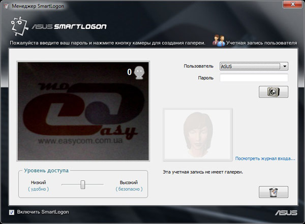 Утилита ASUS SmartLogon Manager является своеобразной системой авторизации, которая осуществляет идентификацию пользователя по лицу с помощью встроенной веб-камеры.
