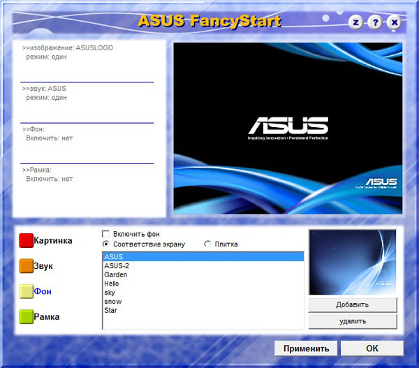 Утилита ASUS FancyStart позволяет выбрать заставку (изображение, фон, рамка) и звуковое сопровождение, которые будут появляться при включении ноутбука.