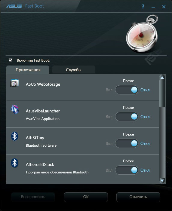 Утилита ASUS Fast Boot позволяет уменьшить время загрузки операционной системы, путем распределения приоритетов запуска различных приложений и служб.