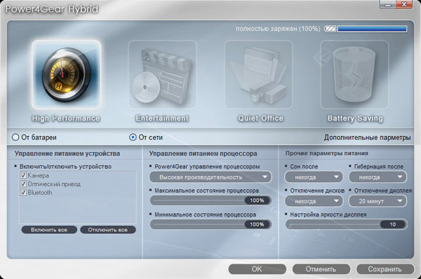 Управление энергопотреблением ноутбука, а соответственно и его производительностью, обеспечивает утилита ASUS Power4Gear Hybrid, в которой предусмотрено четыре полностью настраиваемых режима.