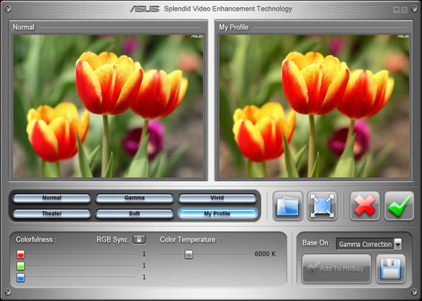 ASUS Splendid Utility или ASUS Splendid Video Enhancement Technology заметно улучшает цветопередачу и позволяет получить более детализированное изображение. Для этого предусмотрено пять предустановленных профилей и один пользовательский.
