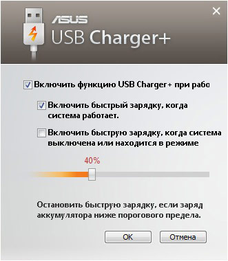 Утилита ASUS USB Charger+ позволяет управлять питанием портов USB, что даёт возможность быстрее заряжать различные USB-устройства, в том числе и при выключенном ноутбуке.