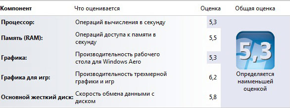 Индекс производительности Windows оценил компоненты ноутбука в 5,3 балла. Наименьшую оценку получил используемый процессор. Наивысшая оценка в 6,2 балла досталась графической подсистеме в режиме обработки 3D-графики.