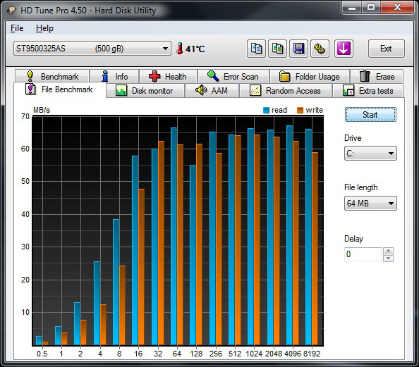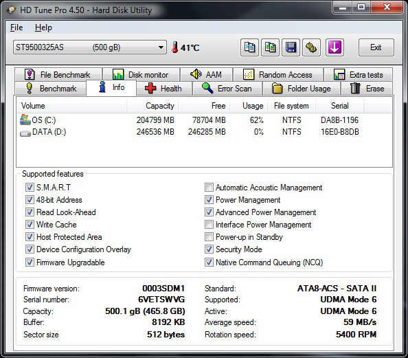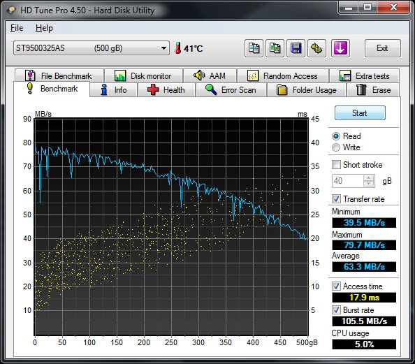Используемый APU AMD A4-3300M, главным конкурентом которого являются процессоры Intel Core i3 второго поколения, обеспечивает приличный уровень производительности, конечно в рамках среднебюджетных моделей. Однако, несмотря на графическое преимущество над процессорами Intel, вычислительные возможности все же несколько ниже. Тем не менее, даже наименее производительного APU A-серии в сочетании с дискретным графическим адаптером AMD Radeon HD 6650M и 3 ГБ оперативной памяти более чем достаточно для повседневной работы с офисными и графическими приложениями, а также с различными видео- и аудиофайлами. В современные игры также можно вполне комфортно побегать, но не на самых высоких настройках. Накопители Дисковая подсистема ноутбука основана на жестком диске Seagate Momentus ST950032 5AS, емкостью 500 ГБ, со скоростью вращения шпинделя 5400 об/мин и буфером данных 8 МБ. Подключается жесткий диск при помощи интерфейса SATA-II. Для получения более подробной информации о накопителе мы воспользовались программой HD-Tune Pro.