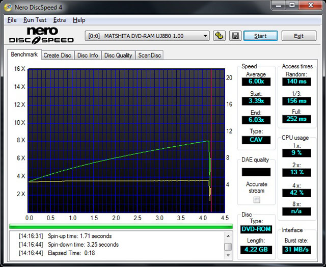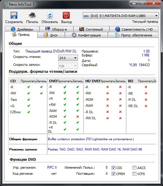 Для работы с оптическими носителями используется привод MATSHITA DVD-RAM UJ8B0, способный работать с практически всеми существующими типами дисков CD и DVD, о чем свидетельствует утилита Nero InfoTool 5:
