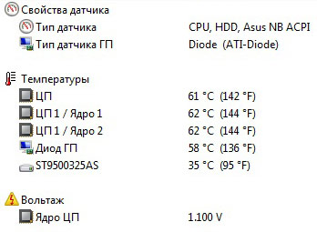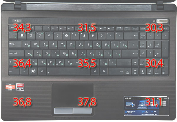 Общий температурный режим ноутбука ASUS K53TA вписывается в ожидаемый диапазон, который сравним с большинством моделей данного класса. Температура корпуса при максимальной нагрузке в среднем совпадает с температурой человеческого тела. Исключением является лишь область над системой охлаждения, температура которой может достигать 43-45°C.