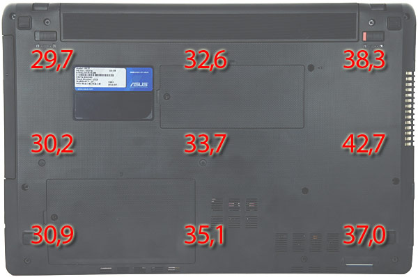 Двухслойный DVD-диск с бракованным вторым слоем Система охлаждения и уровень шума В ноутбуке ASUS K53TA установлена достаточно эффективная система охлаждения, мощности которой достаточно для охлаждения компонентов даже в жаркий летний день. Достоинством данной СО является невысокий уровень генерируемого шума, в том числе и во время выполнения ресурсоемких операций. Температурный режим Для определения эффективности установленной системы охлаждения и общего температурного режима ноутбука во время работы, мы сначала измерили температуру окружающей среды, которая составила +28°C, а затем на 30 минут запустили тестовый пакет Unigine Heaven в режиме DirectX 10. Далее мы, воспользовавшись Scythe Kama Thermo Wireless, образно поделили на девять участков рабочую область и днище ноутбука и измерили температуру каждого из них.