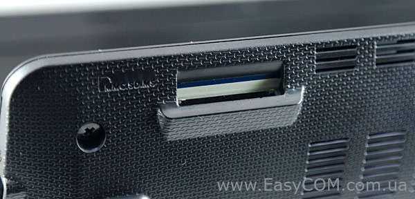 На фронтальной стороне находится лишь мультиформатный кард-ридер, который расположен на скосе, из-за чего во многих случаях для установки карт памяти приходится приподымать переднюю часть ноутбука.