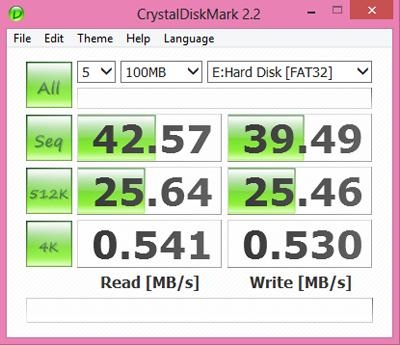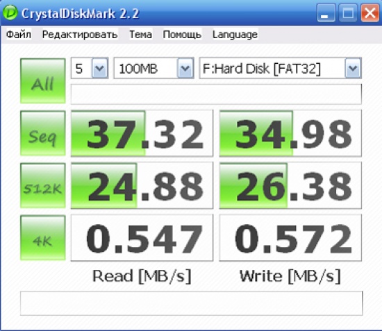Тестирование проводилось при «посредничестве» CrystalDiskMark 2.2. Результат ниже на иллюстрации.