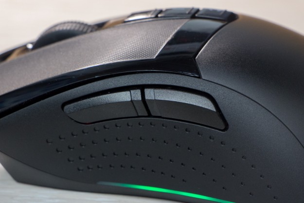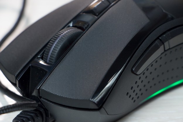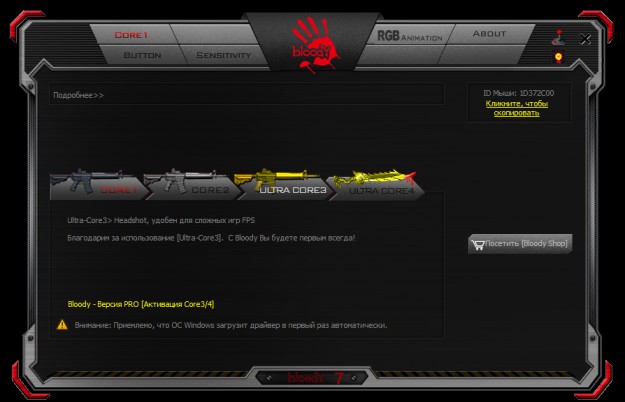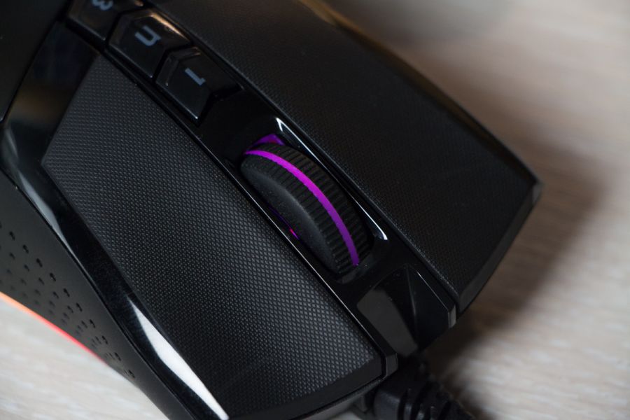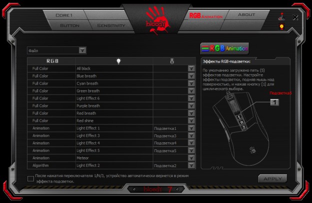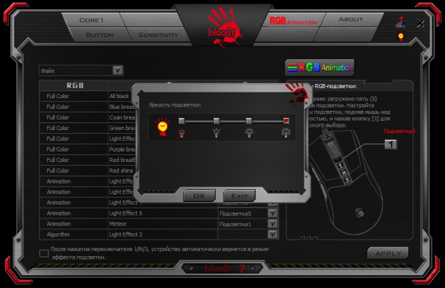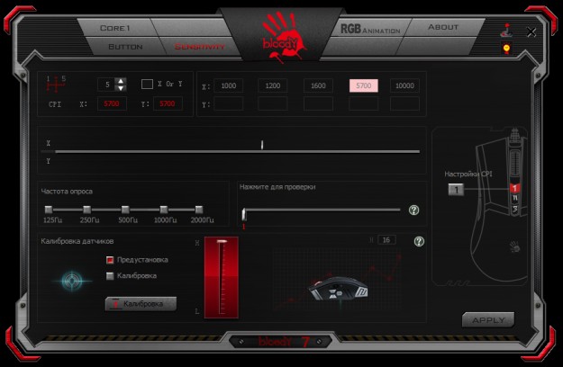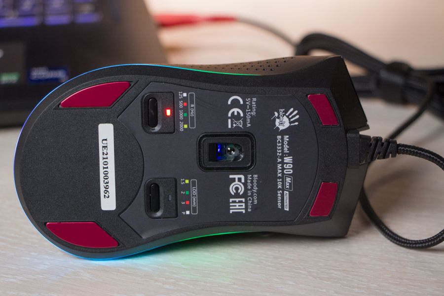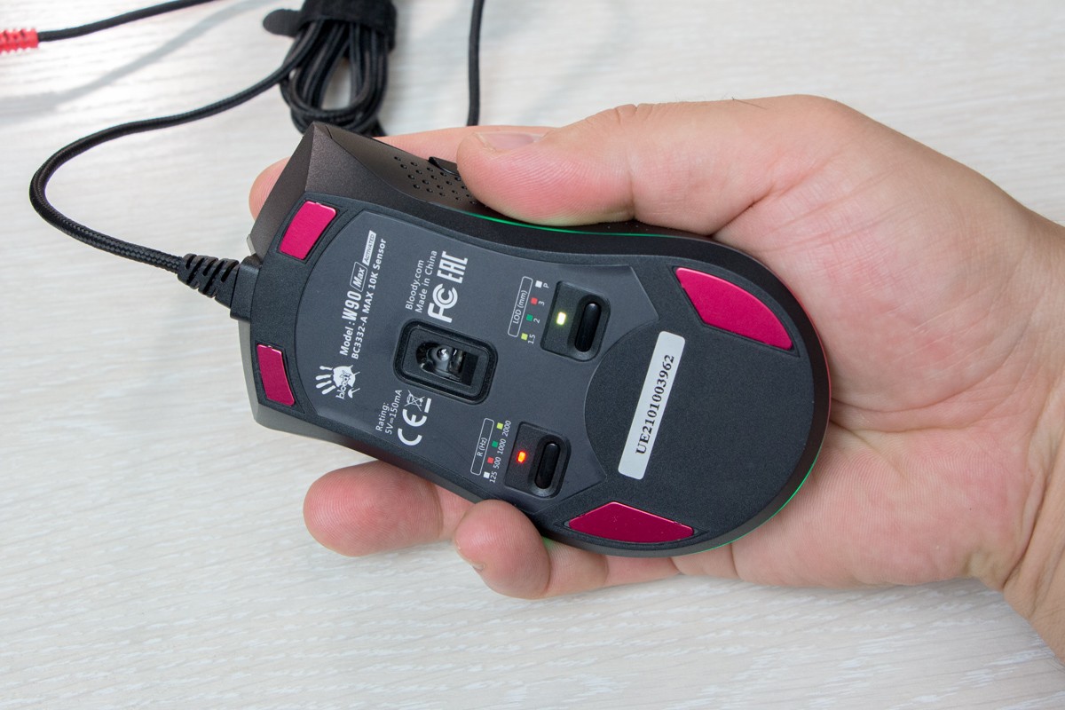 Дизайн и Корпус Bloody W90 Max – не очень большая, но крупная мышка для средних размеров ладони. К компьютеру подключается через провод с тканевой обмоткой. USB вход выполнен в красном дизайне и получил гибкий хвостик длиной в сантиметр. На входе в мышку предусмотрели схожую черную буферную резиновую «втулку», которая ограничивает загиб кабеля. Если смотреть на количество кнопок, то на обзоре сравнительно простая мышка. А вот материалы разнообразны и грамотно комбинируются, придавая форме «мускулистости». С левой стороны мягкий пластик, под ладонью – жесткий, на переходе и вокруг двух основных клавиш – также жесткий, но глянцевый. Материалы приятные и способствуют длительной комфортной работе. Боковые кнопки под большой палец достаточного размера, чтобы по ним не промазать. К верхним переключателям также без претензий, случайных нажатий по ним не было. Нажатие жестковато, но с отчетливым кликом. Основные кнопки покрыты текстурированной резиной, палец с них не соскальзывает, громкость щелчка тише среднего. На нижней крышке у мышки еще две кнопки - для регулировки частоты опроса и высоты отрыва. Ножки металлические, аналогичны A4Tech Bloody W70 Max, которая уже была на тесте Smartphone.ua. Колесико – отдельный важный элемент, в нашем случае с одним режимом работы. Оно прорезинено и в его центре даже есть RGB подсветка. В темноте смотрится интересно и добавляет игровую изюминку к общему дизайну. Нажимать по колесику нужно с небольшим усилием, при прокрутке шаги переключения привычно чувствительны. Здесь производитель покупателя ничем не удивит, и не огорчит. Возможности Ниже на скриншотах показал все возможности, которые дает фирменная программа Bloody7.
