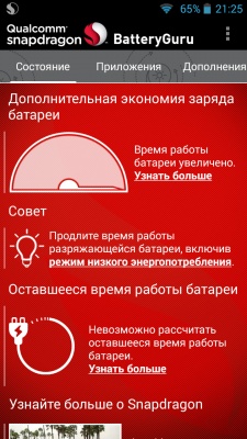 Фирменной надстройки энергосбережения здесь нет, но имеется Snapdragon BatteryGuru –утилита, позволяющая оптимизировать питание аккумуляторов устройств на базе чипа Snapdragon.