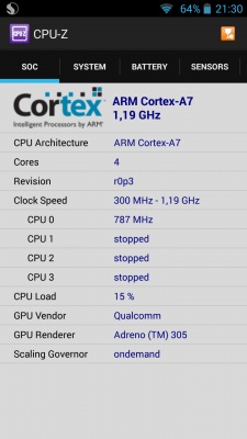 «Сердцем» системы является 4-ядерный Qualcomm Snapdragon 200 MSM8212 (ядро ARM Cortex-A7), тактовая частота которого 1,2 ГГц. Кроме того, «на борту» 1 ГБ оперативной памяти и графика Adreno 305.