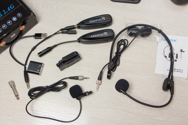 Обзор KIMAFUN KM-G102-3: доступный беспроводной Bluetooth микрофонKIMAFUN KM-G102-3 – это то, что вы ищите, если подбирает универсальный набор из микрофона на петличке и на дужке, который даже на внушительном расстоянии может передавать звук от передатчика к приемнику без проводов. И при этом не стоит дорого – в пределах 60 долларов. Какое качество запили гарантирует устройство и что получает покупатель в комплекте поставки узнаете из обзора. Комплект и корпус Клиент получает от производителя большую коробку, а в ней много всего полезного. Второй микрофон головной - направленный. Он подойдет тем, кто в процессе ведения вебинара крутит головой по сторонам, например, с доски на монитор, а потом на собеседника. Дужка гнется, ветрозащита также присутствует. Пользователь может настроить дужку ближе или дальше ко рту. На передатчике есть регулировка громкости. Ниже в видео показываю, как она работает. Отмечу, что микрофоны большие, такого внушительного размера, что скрыть съемку не получится. Микрофон вставляем и закручиваем, чтобы случайно не выдернуть и контакт был без помех при движении оратора. Дополнительно в коробке есть еще две ветрозащиты, переходник 3,5 на 6,3 мм, а также кабель для подзарядки и сплит микрофон+наушники на USB вход. Полезные цифры: