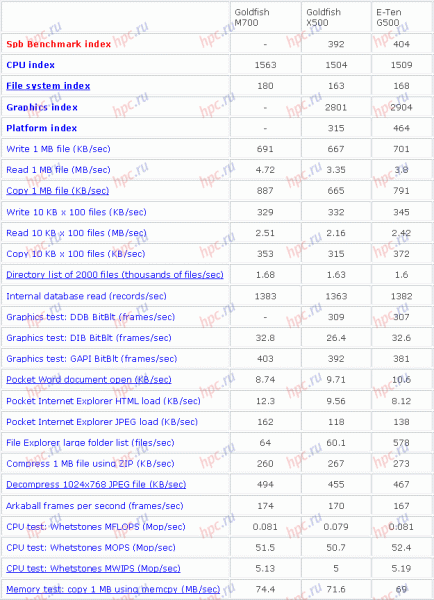 Кстати, уровней регулировки яркости здесь 11, чего вполне достаточно для подбора подсветки практически для любых условий. Кстати, также как и в случае с Glofiish X500, штатными средствами подсветка не отключается. Вы можете только полностью выключить экран, удерживая нажатой клавишу включения/выключения в течение нескольких секунд. Быстродействие и памятьПроцессор Samsung S3C2442 вам должен быть хорошо знаком. Он применялся во всех последних моделях от E-Ten, в упоминавшемся сегодня HTC TyTN и еще нескольких десятках подобных устройств. Стоит ли в очередной раз повторять, что для нужд коммуникатора его производительности хватает за глаза, даже если прибегать к весьма ресурсоемким задачам. В ходе обычного использования коммуникатора заметить какие-либо притормаживания невозможно. И если X500 грешил небольшой задержкой при вызове меню "Пуск", то здесь такого не наблюдается. В том случае, очевидно, что дело было в прошивке. Что ж, а теперь перейдем к тестированию общей производительности системы, которое традиционно проводится с помощью пакета Spb Benchmark. Да-да, как обычно, напоминаем, что доверять следует только результатам пунктов CPU Index и Graphics Index, которые соответственно показывают общую производительность процессора и скорость работы с графикой.