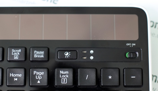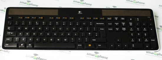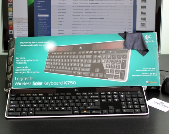 Обзор клавиатуры на солнечных батареях Logitech Wireless Solar Keyboard K750Уже прошло практически 10 лет с момента, когда на рынке появились беспроводные клавиатуры. Однако только совсем недавно компания Logitech представила модель, работающую на самовосстанавливающихся элементах питания. Модель Wireless Solar Keyboard K750 питается от солнечных элементов и о наших впечатления от этого устройства читайте далее. Корпус и сборкаВнешне беспроводная клавиатура от Logitech выглядит стильно. Лицевая поверхность из черного глянцевого зеркального пластика помещена в белый корпус. Причем последний сделан из матового, слегка шероховатого пластика, приятного на ощупь. Заметим, что устройство гармонично смотрится на рабочем столе, особенно в том случае, если монитор имеет такое же глянцевое покрытие. За время эксплуатации устройства, единственным минусом была маркость глянцевого покрытия. Для этих целей в комплекте идет салфетка из материала схожего на микрофибру. Хотя клавиатура и увесистая, однако, при этом толщина устройства всего 7,5 мм. В верхней части лицевой стороны расположены солнечные элементы. Размещены они по углам и каждая пластина имеет 7 секций, посредством которых, собственно говоря, и осуществляется подзарядка элементов питания устройства в дневное время суток. Не стоит думать, что подзарядка элементов питания допустима только в ясную, солнечную погоду и только при прямом попадании солнечных лучей. Заряд отлично накапливается и в помещении, когда свет неоднородно попадает на видимые части солнечных батарей (допустим, вы сидите боком к окну). В ночное время, в условиях плохой освещенности, клавиатура работает от встроенной батареи. Тыльная сторона получила шесть прорезиненных вставок необходимых в системе для обеспечения устойчивости устройства, а также две подножки, для изменения угла ее наклона. Отметим, что самовольного защелкивания вспомогательных подставок замечено не было. Кнопки и управление