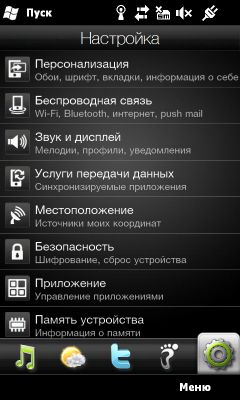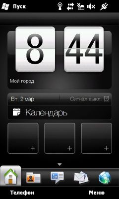 Дисплей в HTC HD2 обладает уникальной технологией – программной оболочкой HTC Sense. Эта оболочка является синтезом различных приложений и разделов меню, которые объединяются в единую систему программ в виде горизонтальной строчки ярлыков. Перейдя по тому или иному ярлыку, пользователь имеет быстрый доступ к необходимому приложению. На панели может помещаться одновременно до пяти ярлыков. Для тех из наших читателей, которые знакомы с оболочкой TouchFLO 3D, оболочка HTC Sense – это немного переработанный и усовершенствованный вариант TouchFLO 3D. ОснащениеОдной из особенностей HTC HD 2, можно называть поддержку Windows Mobile 6.5 Professional. Коммуникатор оснащен процессором Snapdragon. Тактовая частота его составляет 1 ГГц, объем оперативной памяти равен 448 МБ. Объем пользовательской памяти равен 512 МБ. Кроме того, пользователь может расширить встроенную память карточками специального формата. В HTC HD2 это MicroSD. Является или нет плюсом тот факт, что в комплекте поставки идет карта памяти, объемом 2 ГБ – пусть каждый из пользователей решает сам. На наш взгляд, с учетом высокой стоимости продукта, такие мелочи как карта памяти имеют право быть. HTC HD2 оснащен огромным количеством коммуникационных приложений. Прежде всего, в разделе меню «Параметры» предусмотрен специальный раздел «Беспроводная связь», в котором сосредоточены все основные подразделы, модули и приложения для работы с беспроводной передачей и приемом информации: Wi-Fi, Bluetooth и пр.