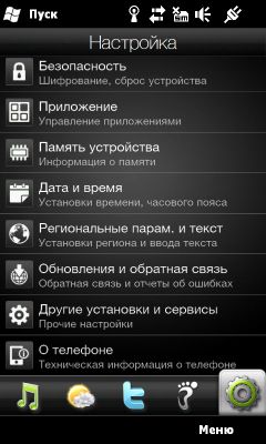 Подпункт меню «Сервис» содержит в себе приложения-настройки для менеджера синхронизаций с компьютером, настройки Интернета, клиент RSS Hub и пр.