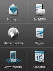 На первой "грани" находятся: почтовый клиент, меню SMS/MMS, браузер Internet Explorer, задачи, календарь и "фирменное" приложение Communication Manager. Communication Manager представляет собой меню с крупными ярлыками, позволяющее быстро, в одно касание включить или выключить любой интерфейс передачи данных, звонок или режим "В самолете".