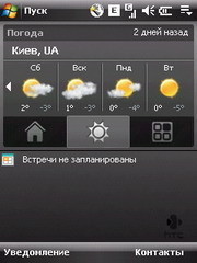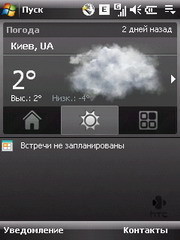 Последняя изюминка интерфейса Touch - виджет HTC Home, опционально отображаемый на стартовом экране "Сегодня". Виджет включает в себя три вкладки: "Дом", "Погода" и "Модуль запуска". Переключаться между вкладками удобно касанием пальца - их пиктограммы достаточно крупные. На основной вкладке отображены крупные четко видимые часы, дата и индикаторы событий, сообщений и пропущенных вызовов. На второй вкладке указана погода для заранее выбранного города: облачность, температура воздуха и прогноз на 4 дня вперед. Данные обновляются через Интернет по требованию пользователя. На вкладке "Модуль запуска" находятся девять настраиваемых ячеек для быстрого запуска приложений.