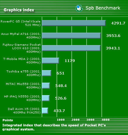 Большинство из представленных «девайсов» работает на интеловских процессорах, поэтому победа флагмана линейки предсказуема - PXA 272 вне конкуренции. Наиболее близко к роверу подобрался HP iPAQ H5550, но он работает на менее мощном Intel XScale PXA255 с тактовой частотой 400 МГц. Еще один важный тест - тест графики, ведь просмотр видео - одна из наиболее часто используемых опций в смартфонах, коммуникаторах и КПК. Вот его рузультат: