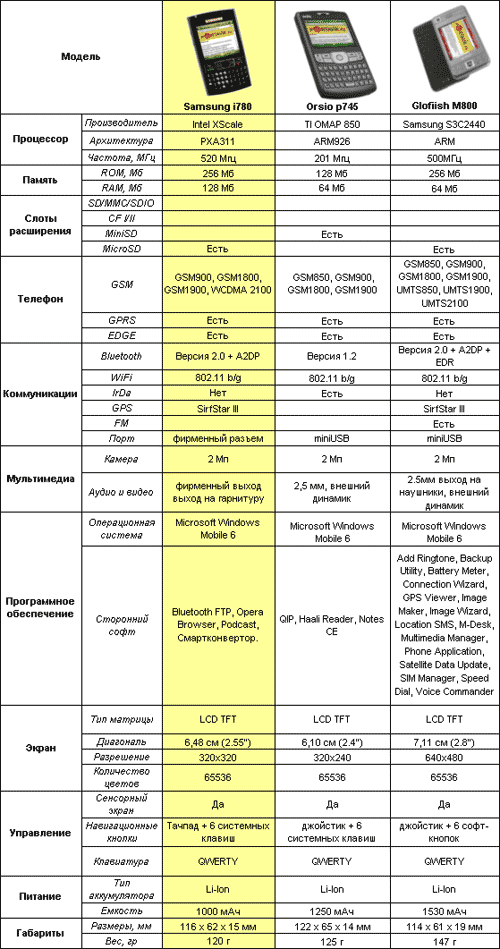 Сравнение коммуникатора Samsung SGH-i780 со схожими с ним по техническим характеристикам девайсами ORSiO p745 и Glofiish M800 можно увидеть из таблицы.