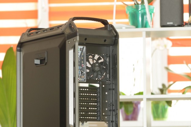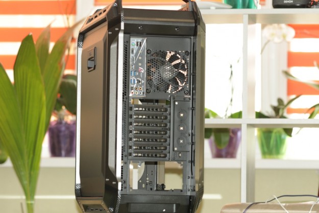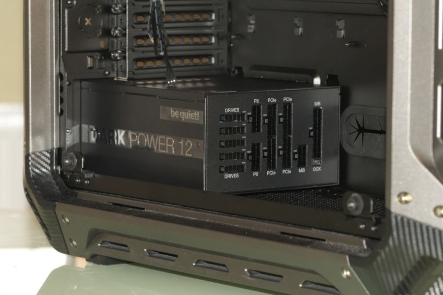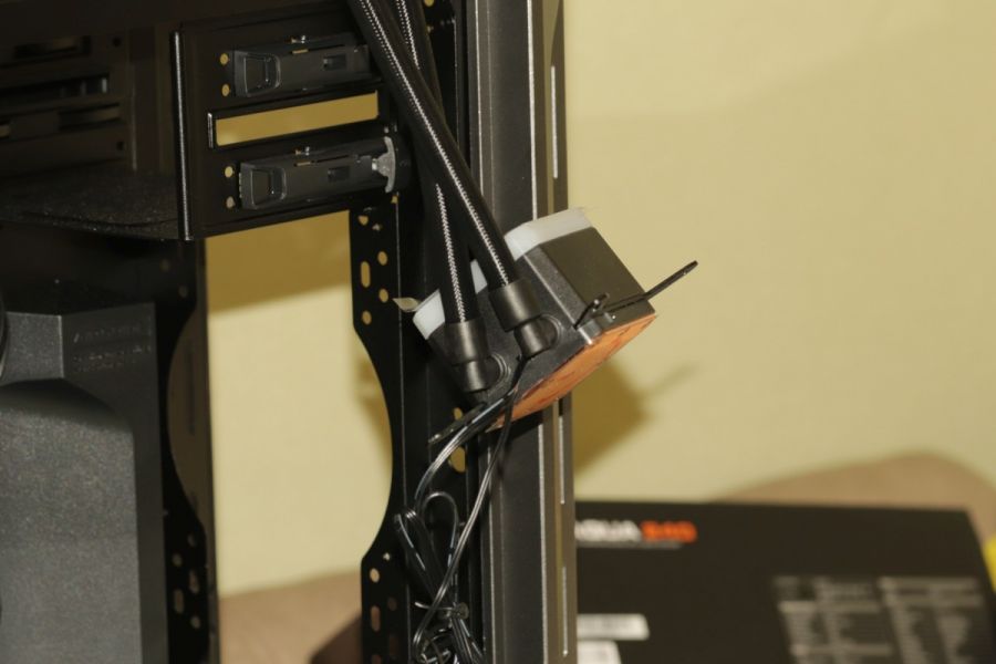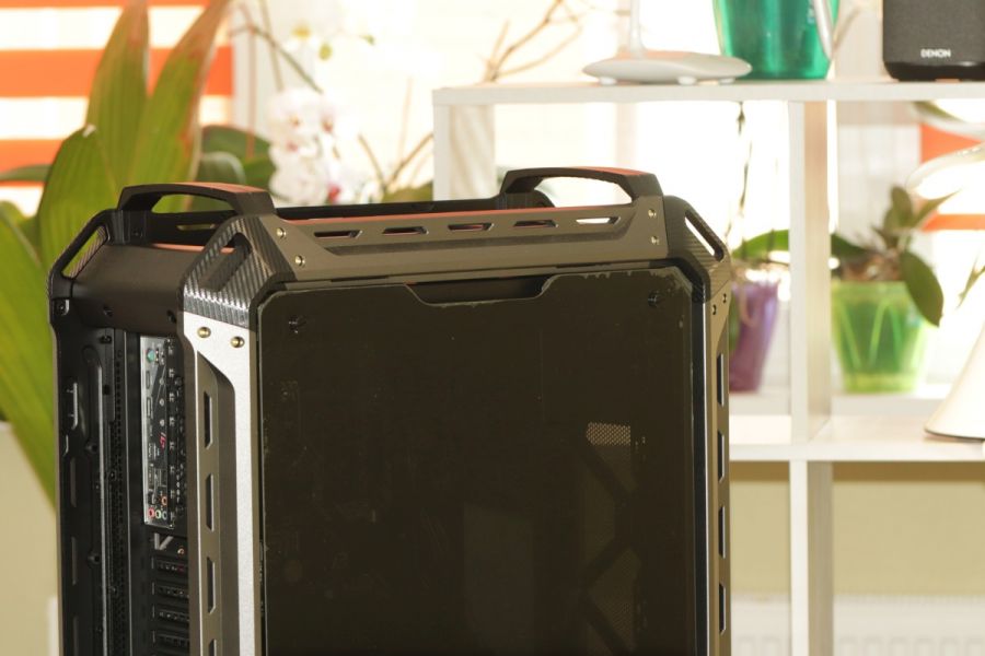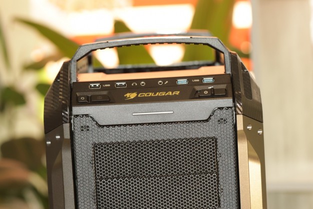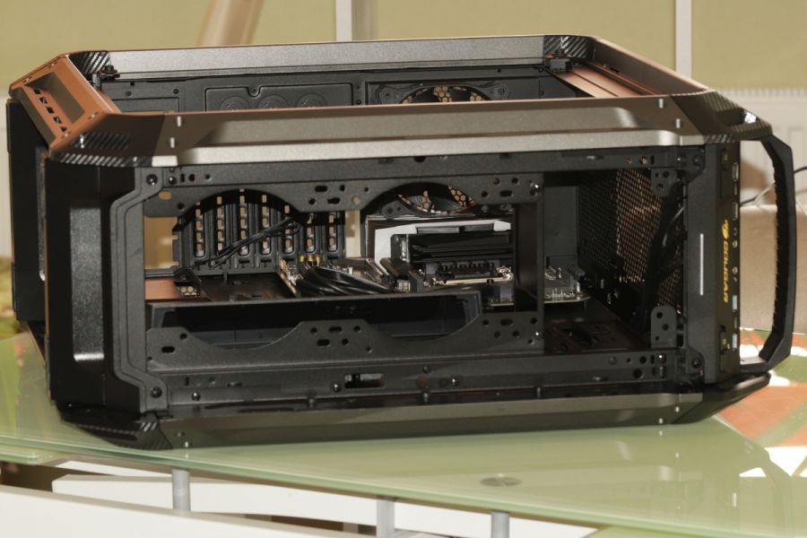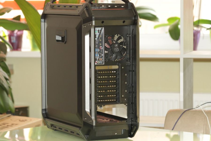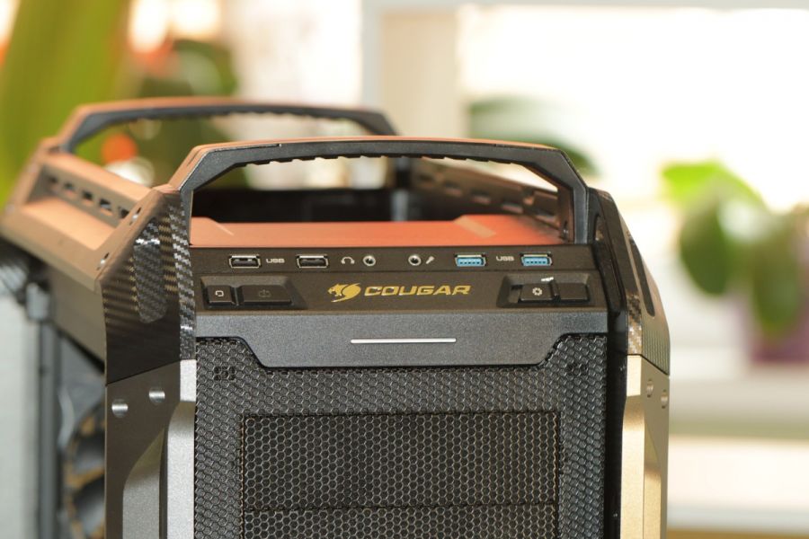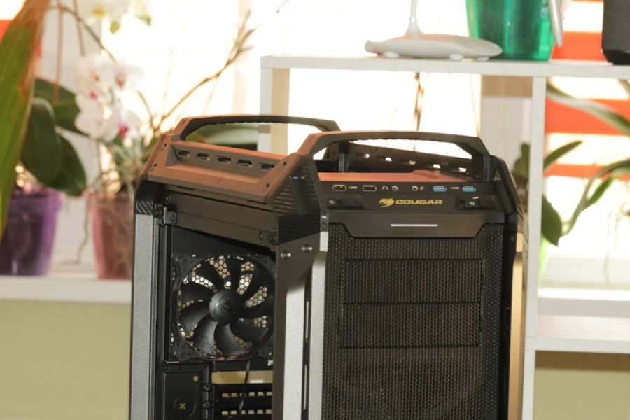 С качеством оплетки кабелей внутри проблем нет – сгибали и не раз, в том числе в формате перехлестов. Пластиковый рассекатель воздуха, а также кожух, который прикрывает блок питания и «прячет» лишние кабели выполнены хорошо, однако сам материал довольно тонкий, а потому когда будете снимать кожух (а без этого никак), делайте это аккуратно. Ну и не могли мы не обратить на ручки сверху корпуса, ведь их также встретишь отнюдь не в каждой модели. Удобны ли они? Более чем. Надежны? Давайте посчитаем. Вес, под которым эти ручки могут «отлететь» - 36 кг. Вес самого корпуса – около 16 кг. Получится ли у вас «напихать» 20 кг комплектующих, чтобы начать опасаться за ручки? Мы не это оказались неспособны, хотя в закромах у нас есть немало тяжелых вещей для сборки мощных системных блоков. В целом о проработке корпуса уже все было сказано – никаких замечаний здесь нет. Проработка самого металлического шасси также на должном уровне. Впечатления по части дизайна Свое крутое (и да, здесь я не побоюсь этого слова) название Panzer рассматриваемая модель получила исключительно через дизайн. Отмеченные уже не единожды ребра - ну чем не панцирь? У Cougar есть разные корпуса, в том числе, открытого типа, и смотрели мы немало разных моделей, но почему-то именно Max-G подкупает больше всего. Пока, по крайне мере. Элементы передней панели Итак, выше у нас уже была возможность ознакомиться с тем, как обустроена передняя панель корпуса. Вся сеточная часть закреплена на защелки и при необходимости легко снимается простым нажатием на нее же вверху. В теле сеточной части два выводы под устройства 5,25 дюйма. Сама фиксация этих устройств безвинтовая и вполне надежная. Под сеткой, и это мы уже также отмечали - “посадочные места” под вентиляторы, либо радиатор СЖО. К слову, пространство между сеткой и местами крепления радиатора довольно таки невелико, что следует учесть при выборе “водянки”. Интересной особенностью комплекта поставки, о чем, кстати, мы не упоминали выше, является специальный крюк, на который пользователь может подвесить наушники, если те не нужны ему в конкретный момент. С точки зрения эргономики это удобно. Есть чем «зацепить» внимание и с точки зрения портов/разъемов спереди: по два USB 3.0 и 2.0, разъем для подключения наушников и отдельный – микрофона, а еще один 3-позиционный регулятор скорости вращения вентиляторов. Да, полностью вы их не отключите, да и нужно ли, а вот регулировать поток в зависимости от нагрузки на систему – «вещь» интересная и удобная. Компоновка тыльной панели Оформление задней стенки можно назвать классическим за небольшим лишь исключением (да и то весьма условным) в виде отверстий под выводы шлангов системы жидкостного охлаждения. Ну и само собой отмеченные ранее ребра. Ну, а как же без них, ведь это главная фишка дизайна Max-G. В самом верху находится вывод под интерфейсную заглушку платы. Напротив него вентиляционная сетка ко внутренней стороне которой прикреплен 120-миллиметровый вентилятор. Далее расположены восемь слотов расширения, а в самом низу – «посадочное место» под блок питания. По поводу слотов расширения, практически все они прикрыты металлическими заглушками за исключением одного. Причины такого решения нам не ясны, но назвать это проблемой мы также не можем. Внутренний интерьер Во внутренней компоновке системы понравилось 