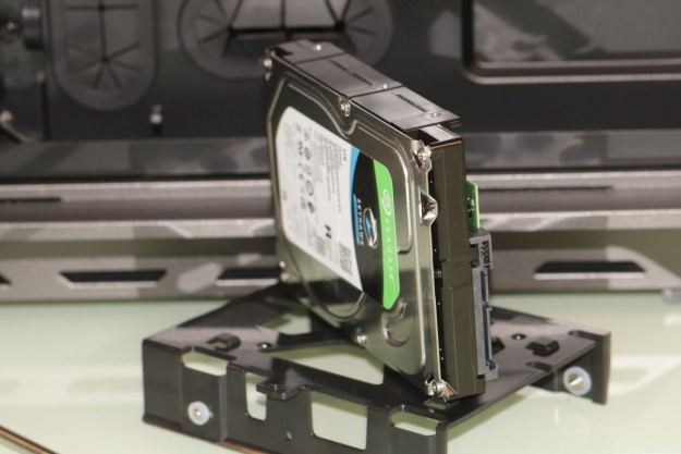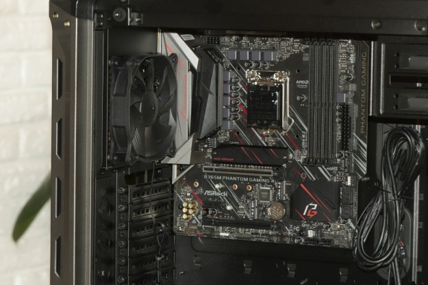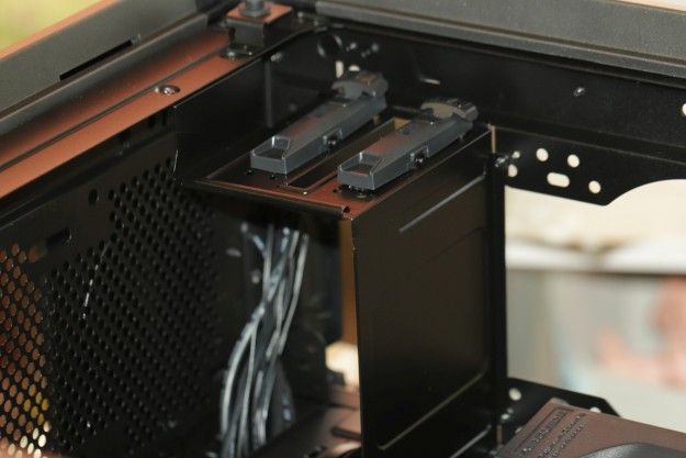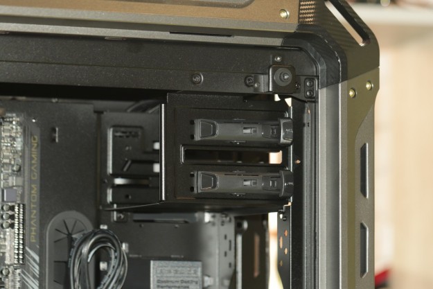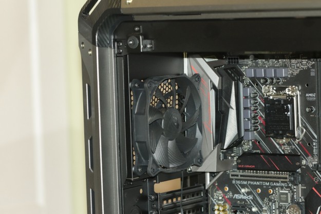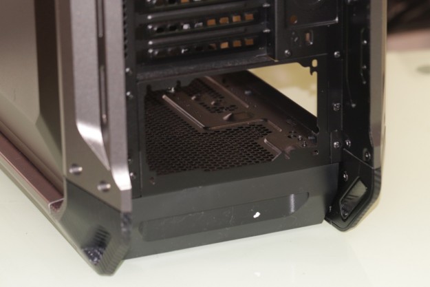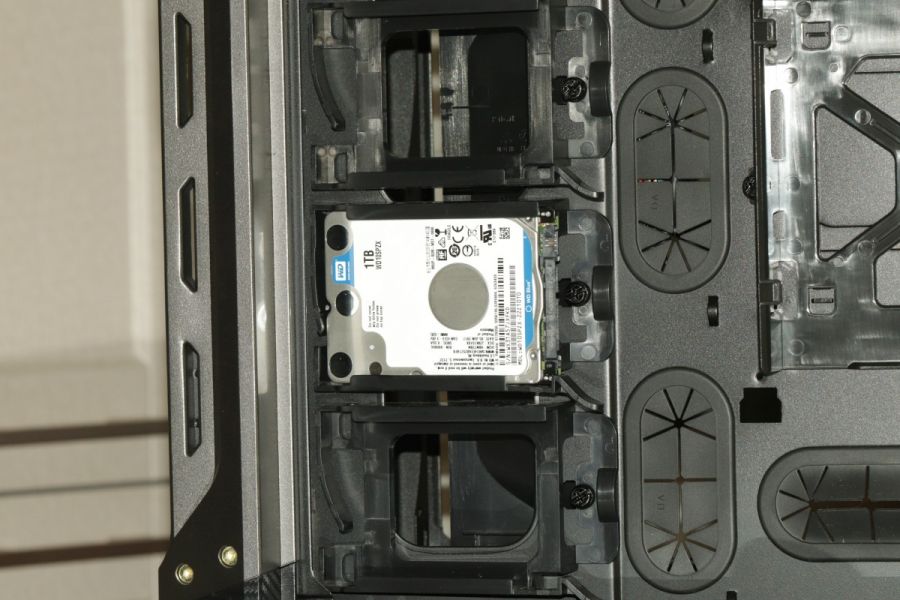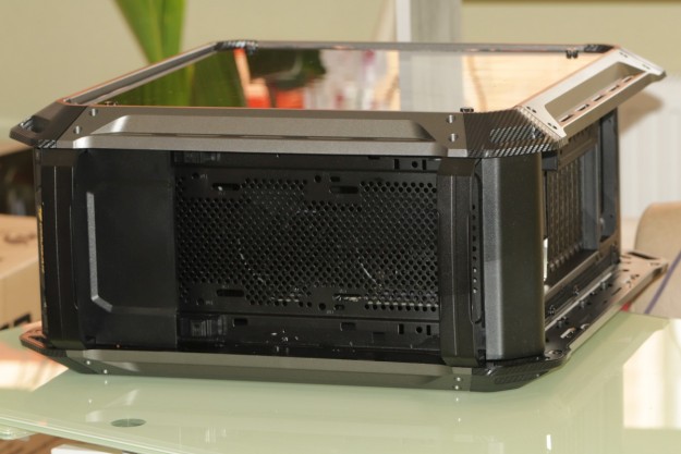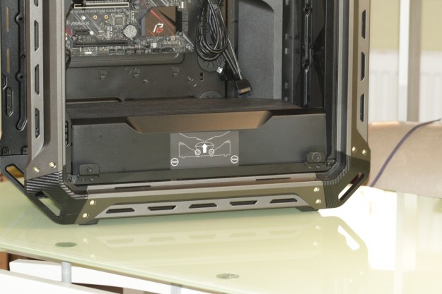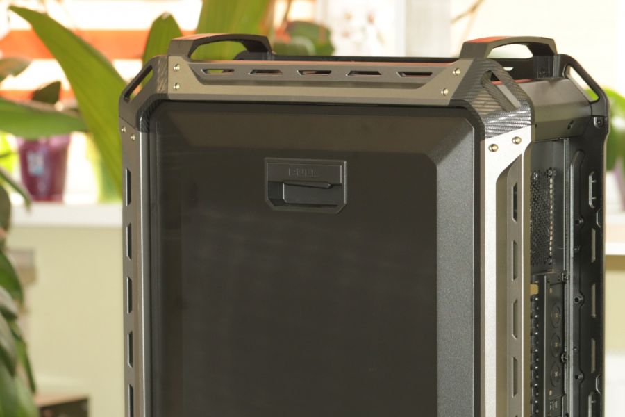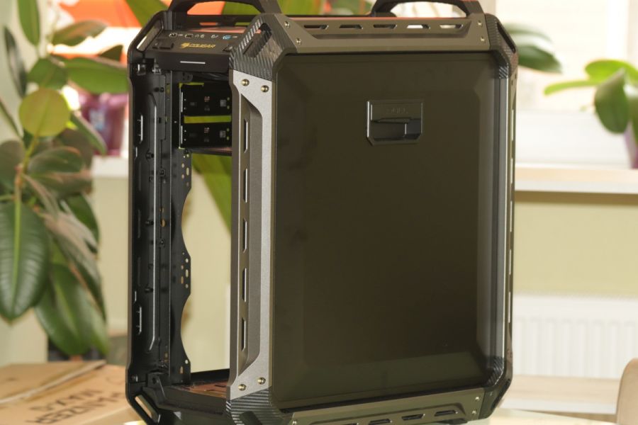 Использованные материалы и качество сборки Cougar Panzer Max-G – это объединение мощного металлического шасси, толщина которого до 2 мм, а также пластика, каленого стекла плюс небольшого количества резиновых вставок. Касательно последних, речь идет о заглушках выводов под шланги СЖО. Стекло – одна из съемных боковых панелей. Все остальное – пластик, включая ребра, «вынесенные» чуть выше корпуса. Кстати, они нам почему-то напомнили кумулятивные экраны, которые строили наши военные на БТР-ы в далеких 2014-16 годах. Видимо, именно из-за таких выносов на торцах корпус и получил соответствующее название. Что ж, выглядит, в самом деле, круто. Упомянутое выше стекло черного цвета. Фиксация панели из этого вида материала на корпусе выполняется при помощи болтов. Поскольку у этих крепежей большие накатанные головки, снять панель можно и не бегая за отверткой – откручивается предельно легко. Еще проще с металлической съемной панелью – формат ее крепления – прочная пластиковая защелка. В надежности убедились лично – произвольно крепление не расстегивается. Второй формат креплений, который также обратил наше внимание – защелки. По роду своей деятельности мы пересмотрели довольно много различных моделей корпусов, однако Cougar Panzer Max-G – первое предложение на нашей памяти с такого рода крепление сетки сверху, под которой «прячется» пылевой фильтр, а также сетки на передней панели, да и некоторых других «мелочей». Это вполне надежно на практике, а кроме того, обеспечивает быстрый доступ к разным компонентам. Например, за сеткой передней панели вы можете разместить вентиляторы системы охлаждения. Да, что интересно, о наличии их здесь заявлено по умолчанию, но в нашем случае под сеткой спереди «вертушек» не было. Почему? Ответ на этот вопрос мы пока не нашли.