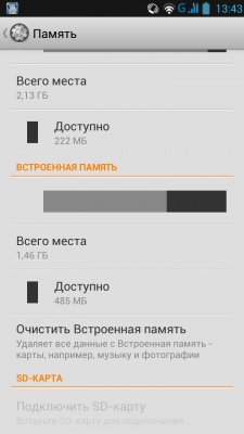 Из 4 ГБ заявленной внутренней памяти пользователю доступно лишь порядка 1,5 ГБ, что в рамках сегодняшних реалий критически мало. Для приложений и легких игр этого объема будет вполне достаточно, а вот для более тяжелых игрушек или же загрузки фильмов в разрешении Full HD попросту не хватит.