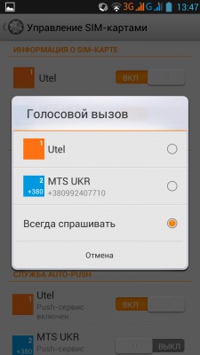 Поддержка режима dual-SIM реализована традиционным для смартфонов на базе процессоров MediaTek образом. В меню «Управление SIM-картами» пользователь может включить/отключить одну из SIM-карт, выбрать какую симку использовать для вызова, SMS/MMS-сообщений или подключения к мобильному Интернету.