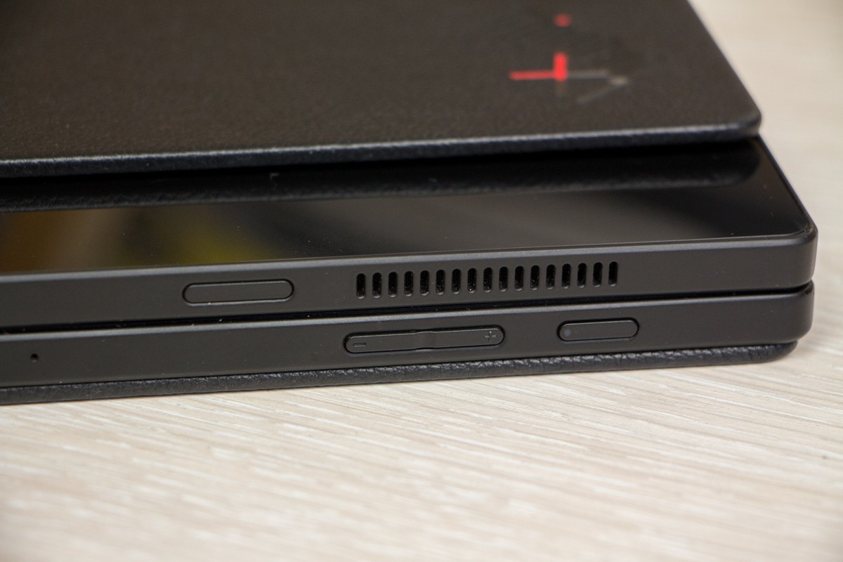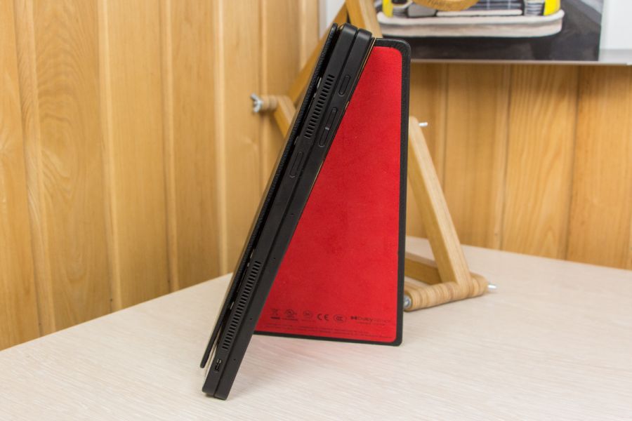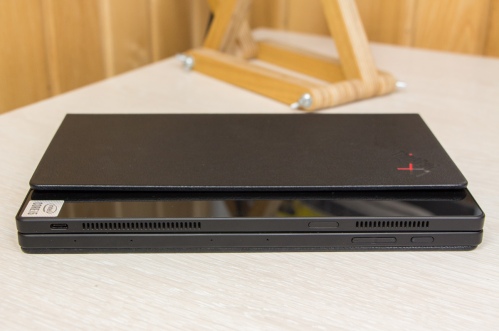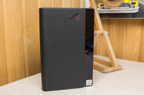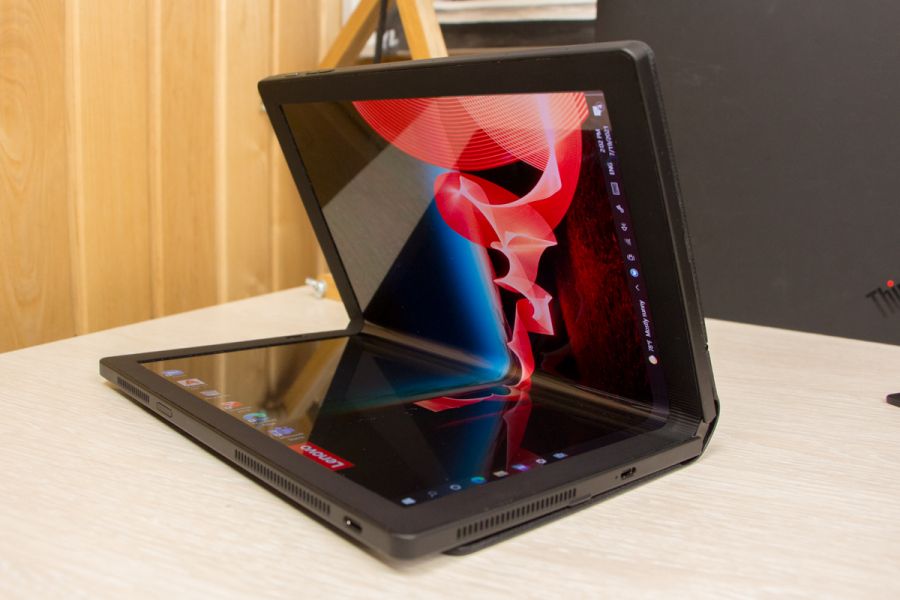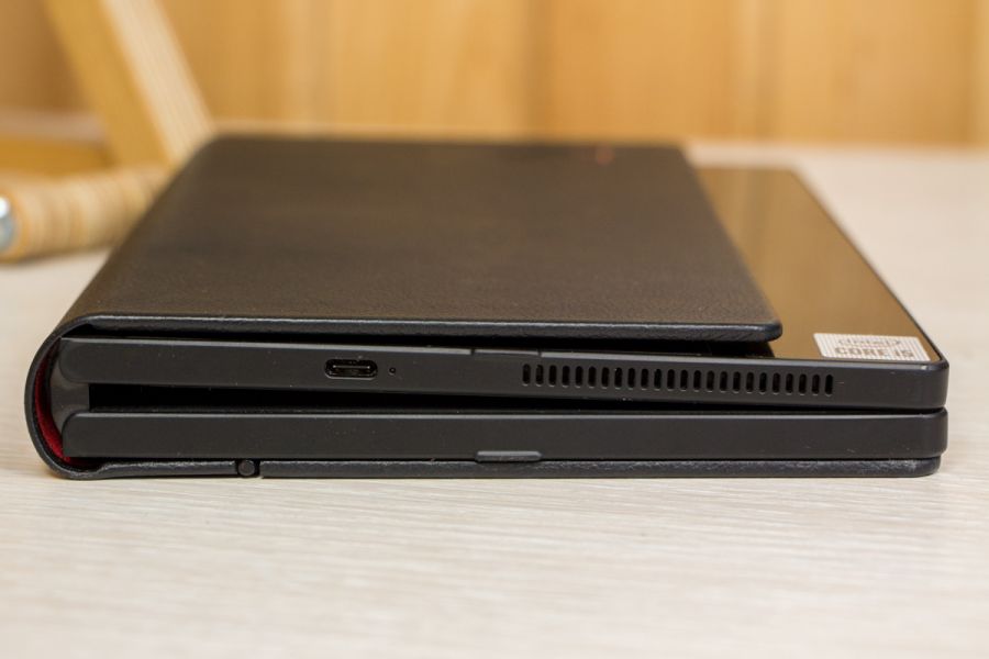 Ко всему прочему, не очень понятно, почему нужно платить более $4400 за устройство с гибким дисплеем, которое не дает топовой производительности. Возможно лучше собрать комплект из игрового ноутбука и премиального планшета? Тогда еще и на смартфон с гибким дисплеем останутся деньги. Дизайн и Корпус Внешность у Lenovo ThinkPad X1 Fold изящная и точно самобытная. В корпусе грамотно сочетаются кожа, стекло и магниевый сплав. О надежности конструкции говорит наличие сертификации по стандарту MIL-STD-810G. Уголок кожаной крышки можно использовать в качестве подставки. Таким образом трансформируем ноутбук в моноблок. Кнопку питания и качельку регулировки громкостью вынесли на один торец. Рядим с ними микрофоны. С противоположного торца Type-C порт (USB 3.2 Type-C Gen2) и решетки для отвода тепла. Габариты компактные 158 x 235,6 x 27,8 мм, вес 999 г. Однако не забываем о немаленьком блоке питания, способном зарядить батарею за час до 80%. Хорошо, что его можно не носить с собой, потому что автономности достаточно. До 8 часов без перерыва можно смотреть видео в полный экран на 40% от максимальной яркости. Столько же времени ноутбук проработал у меня в режиме набор текста/Photoshop. Клавиатура Гибкость — не единственное необычное качество дисплея ThinkPad X1 Fold. Он может работать в качестве экранной клавиатуры и тачпада. При желании клавиатуру Lenovo Fold Mini Keyboard для данного ноутбука можно приобрести отдельно. Находясь внутри закрытой системы и накапливая заряд путем намагничивания экрана, она может автономно работать в течение 8 часов. Удобно, что с ней можно выполнять задачи по набору текста продолжительное время, не опасаясь, что заряд закончится в самый неподходящий момент. Клавиатура, расположенная на нижней половине дисплея, превращает ThinkPad X1 Fold в обычный ноутбук. Если хочется воспользоваться планшетом, ее легко убрать. Аппаратная начинка