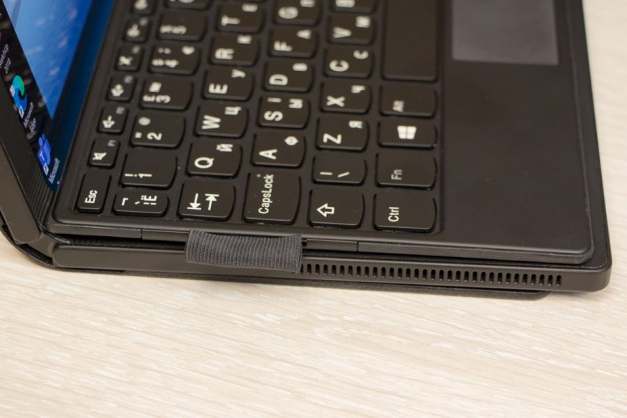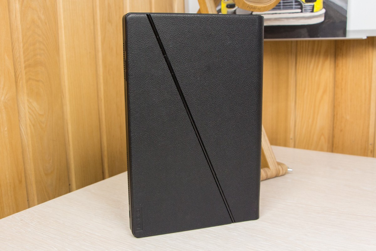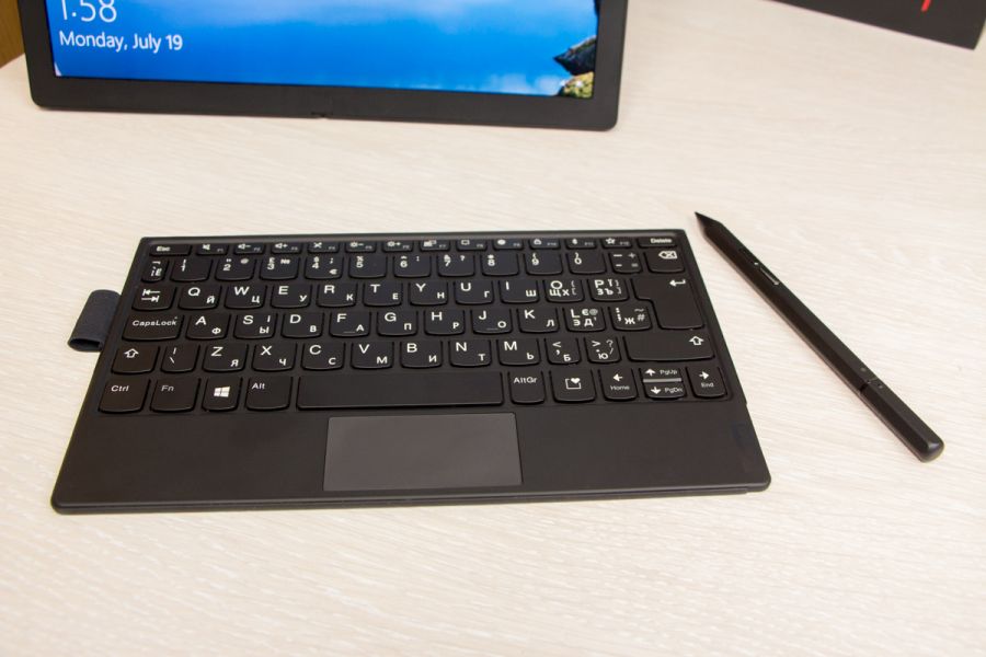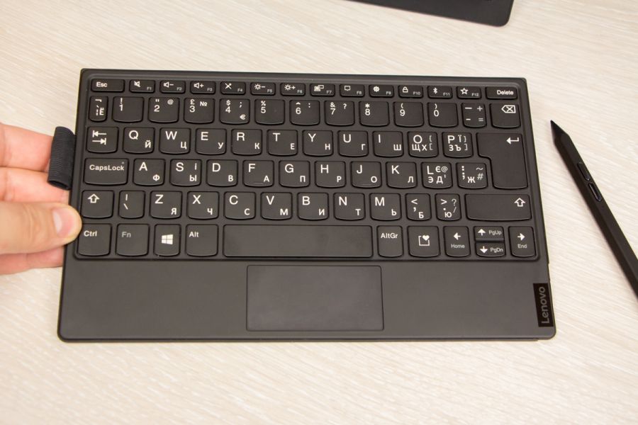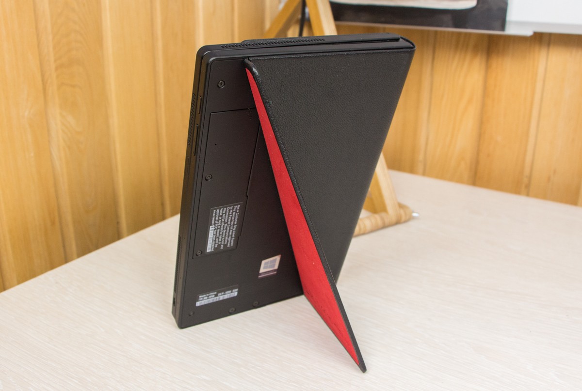 Ко всему прочему, не очень понятно, почему нужно платить более $4400 за устройство с гибким дисплеем, которое не дает топовой производительности. Возможно лучше собрать комплект из игрового ноутбука и премиального планшета? Тогда еще и на смартфон с гибким дисплеем останутся деньги. Дизайн и Корпус Внешность у Lenovo ThinkPad X1 Fold изящная и точно самобытная. В корпусе грамотно сочетаются кожа, стекло и магниевый сплав. О надежности конструкции говорит наличие сертификации по стандарту MIL-STD-810G. Уголок кожаной крышки можно использовать в качестве подставки. Таким образом трансформируем ноутбук в моноблок. Кнопку питания и качельку регулировки громкостью вынесли на один торец. Рядим с ними микрофоны. С противоположного торца Type-C порт (USB 3.2 Type-C Gen2) и решетки для отвода тепла. Габариты компактные 158 x 235,6 x 27,8 мм, вес 999 г. Однако не забываем о немаленьком блоке питания, способном зарядить батарею за час до 80%. Хорошо, что его можно не носить с собой, потому что автономности достаточно. До 8 часов без перерыва можно смотреть видео в полный экран на 40% от максимальной яркости. Столько же времени ноутбук проработал у меня в режиме набор текста/Photoshop. Клавиатура Гибкость — не единственное необычное качество дисплея ThinkPad X1 Fold. Он может работать в качестве экранной клавиатуры и тачпада. При желании клавиатуру Lenovo Fold Mini Keyboard для данного ноутбука можно приобрести отдельно. Находясь внутри закрытой системы и накапливая заряд путем намагничивания экрана, она может автономно работать в течение 8 часов. Удобно, что с ней можно выполнять задачи по набору текста продолжительное время, не опасаясь, что заряд закончится в самый неподходящий момент. Клавиатура, расположенная на нижней половине дисплея, превращает ThinkPad X1 Fold в обычный ноутбук. Если хочется воспользоваться планшетом, ее легко убрать. Аппаратная начинка