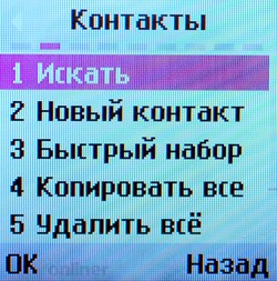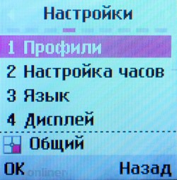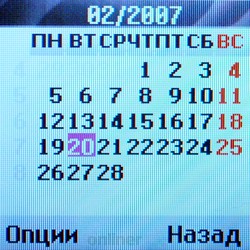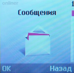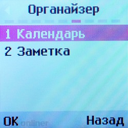 На левой грани аппарата расположено отверстие для зарядки и подключения гарнитуры, спрятанное под крышкой. Других кнопок и отверстий по бокам нет, если не считать прорези для ремешка в правом верхнем углу. Пластмассовая крышка заднего отсека снимается легко и обнажает литиево-ионную батарею емкостью 800 мАч (в тестируемой модели). Как ни странно, аккумулятор раскрашен в яркие цвета, что заметно контрастирует со строгим видом корпуса. Внутри находится модуль для SIM-карты, который выполнен на манер телефонов Siemens, то есть достать его достаточно трудно. Конструкция разъема довольно сильно отличается от традиционной для производителя. МенюНа главном экране пользователя встречает стандартная информация: уровень сигнала, заряд батареи, текущее время и дата. Некоторые функции доступны при нажатии четырехпозиционной кнопки. Нажатие «вправо» вызывает календарь, «вниз» — список контактов, «влево» — окно создания нового сообщения, «вверх» — профили. При желании подсказку о функциональности того или иного «направления» главной клавиши можно отобразить на экране ожидания.