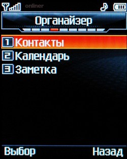 Контакты оказались в органайзере. Спорное решение, поскольку довольно часто требуется быстрый доступ к меню контактов, например, чтобы добавить новый контакт или получить доступ к контактам на sim-карте. Придется делать лишние движения по меню или добавлять «контакты» в список избранных.