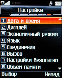 Стиль и иконки меню остаются неизменны. При смене тем меняется цветовое и звуковое оформление. Меню представлено классической матрицей 3х3: профили, вызовы, аксессуары, органайзер, сообщения, мультимедиа, браузер, мои папки, настройки.
