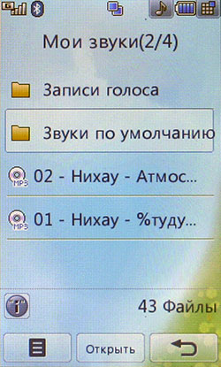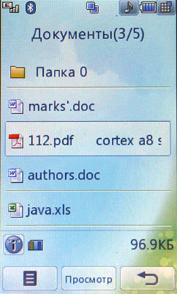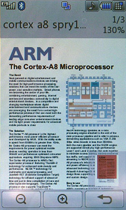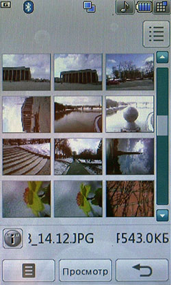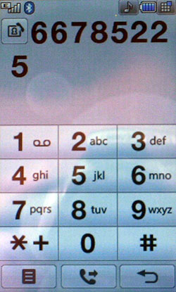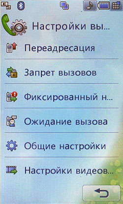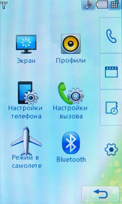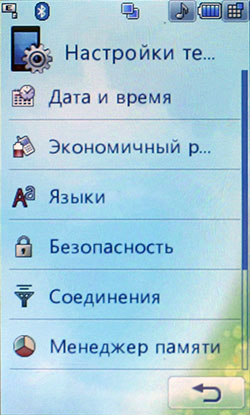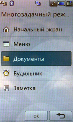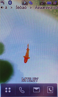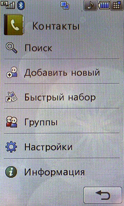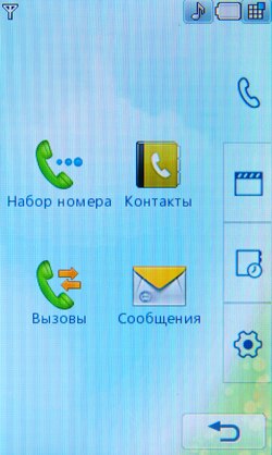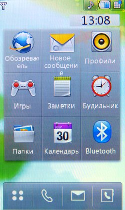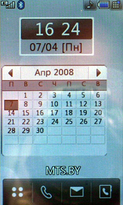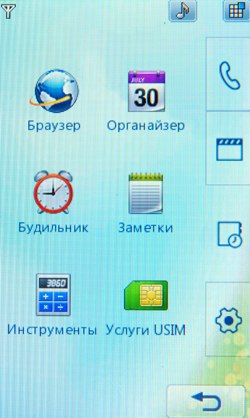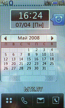 К сожалению, Java-тесты не показывают сверхвысоких результатов. Скорее всего, расчеты вел основной процессор, а мультимедийным «умеет» пользоваться только встроенное ПО. С другой стороны, производитель заявляет, что 3D-подсистема способна показывать производительность на уровне Sony PlayStation 1. Встроенные программы для проигрывания или редактирования видео, работы с камерой, редактирования и просмотра картинок работают напрямую с мультимедийным процессором. В итоге качество и удобство работы с мультимедийными функциями невообразимо высокое. Звук, к сожалению, обрабатывает не Zoran, а WM8983, штатный аудиокодек/усилитель, подключенный к центральному процессору. Аудиоподсистема Zoran предложила бы, вероятно, лучший результат. Телефон поддерживает офисные файлы и проигрывание Flash SWF. Последнее реализовано на уровне ОС, Doc, Xls, Ppt открывает Picsel File Viewer. На широком экране с сенсорным управлением очень удобно просматривать даже электронные таблицы. Программа работает быстро, хотя многие удобства, которые можно было бы реализовать с помощью сенсорного дисплея (ту же навигацию по странице), разработчик оставил в стороне. 128 МБ оперативной памяти позволяют полноценно реализовать многозадачность. Нам не удалось заставить аппарат тормозить даже при запуске множества приложений. Кстати, одновременно c двумя Java-приложениями работать нельзя. Выделенной клавиши громкости в телефоне нет. Она заменена оригинальным колесиком, установленным на объектив камеры. Колесико позволяет уменьшать и увеличивать картинку в режиме камеры или видео, регулировать размер веб-страниц в браузере, перемещаться по пунктам меню. В нашем образце оно срабатывало не всегда: в некоторых меню требовалось сначала выбрать один из пунктов, после чего поворот колесика вызывал какое-либо действие. Иногда действие обрабатывалось только в одну сторону. Спишем данную ошибку на сырость инженерного образца. Дизайн меню напоминает LG Prada, но на самом деле здесь совершенно другое решение. Оно идентично меню LG KF700. Собственно, основной функционал описан в обзоре слайдера. В этой статье остановимся лишь на особенностях конкретной версии меню. На десктопе имеются 4 иконки: меню, набор номера, меню сообщений, поиск в адресной книге. Главное меню поделено на 4 закладки: телефон (набор номера, контакты, журнал звонков, меню сообщений), мультимедиа (менеджер файлов, камера, Muvee studio, аудиоплеер, медиаплеер, диктофон, радио, игры), приложения (браузер, органайзер, будильник, заметки, инструменты, услуги SIM) и настройки (экран, профили, настройки телефона, настройки вызова, режим в самолете, Bluetooth). Расположение логичное, до самых востребованных пунктов добраться легко. В дежурном режиме можно отобразить картинку или виджеты календаря, аналоговых часов, панели быстрого запуска. Календарь неактивный, в нем не отображаются запланированные события, нельзя добавить новое. То же самое можно сказать о часах: их нельзя использовать для установки будильника либо других функций.