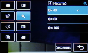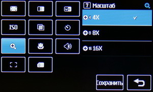 Можно изменять коэффициент цифрового зумирования, который выставляется в настройках от 4х до 16х. В настройках можно изменить работу вспышки, сюжетную программу, экспозицию и режим съемки: