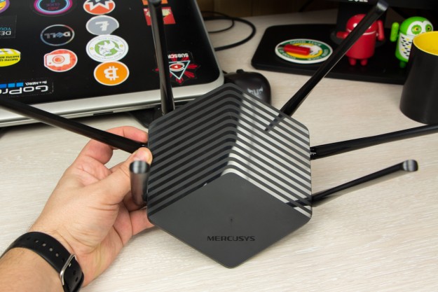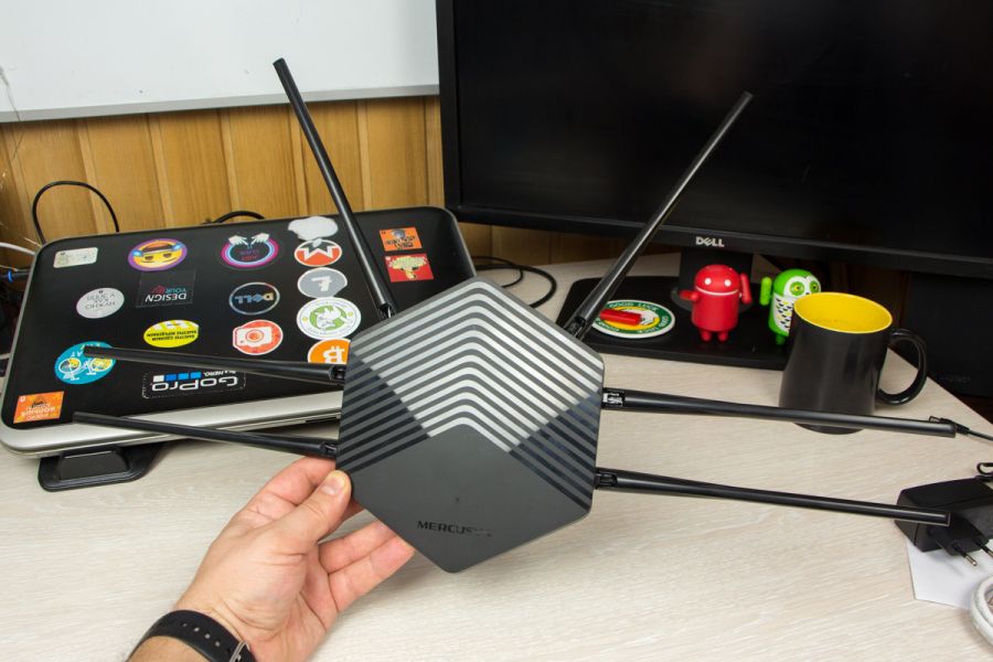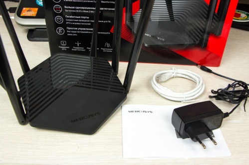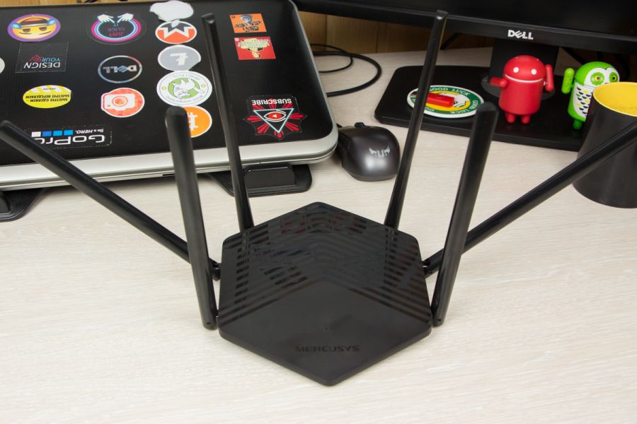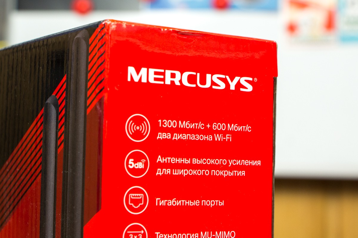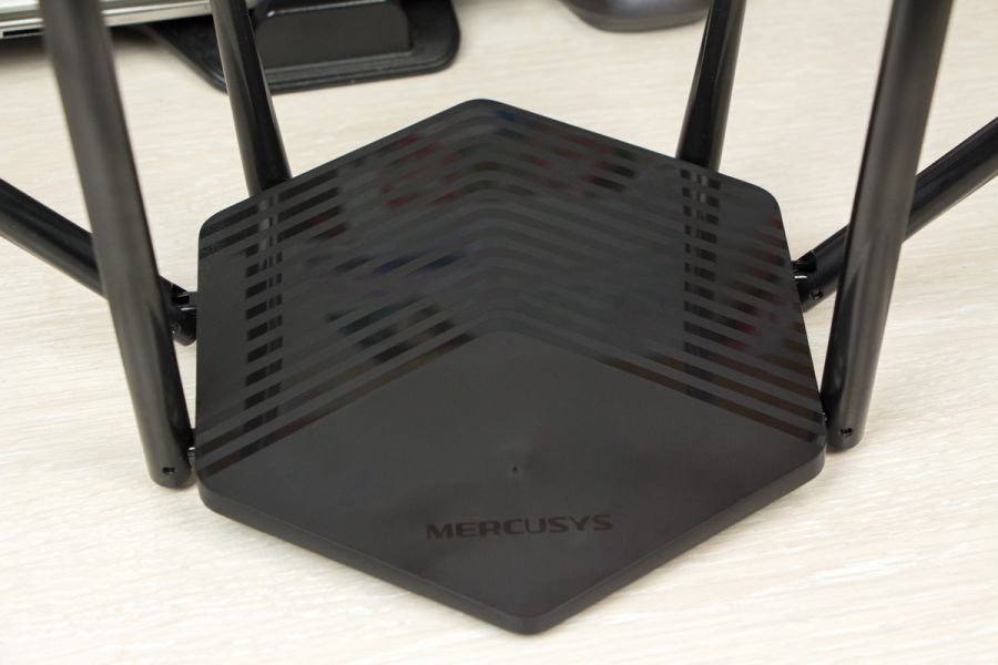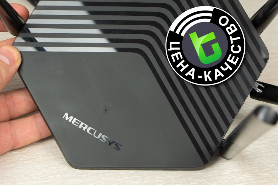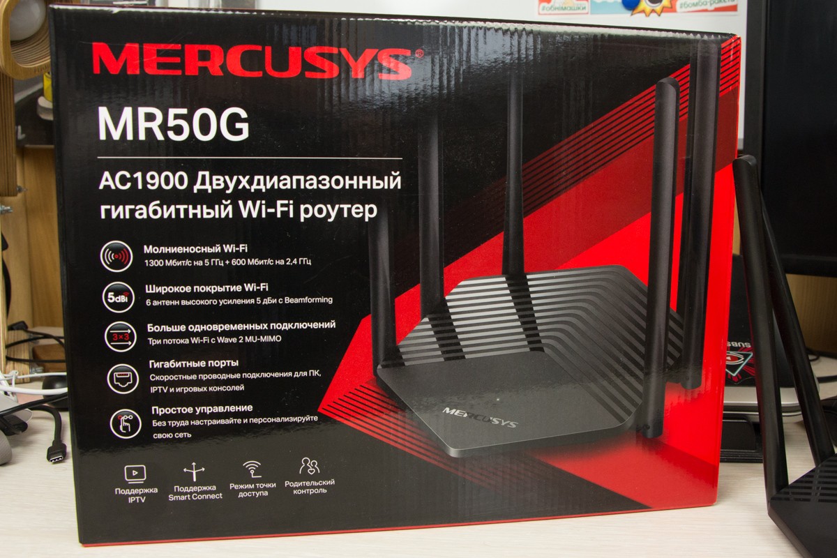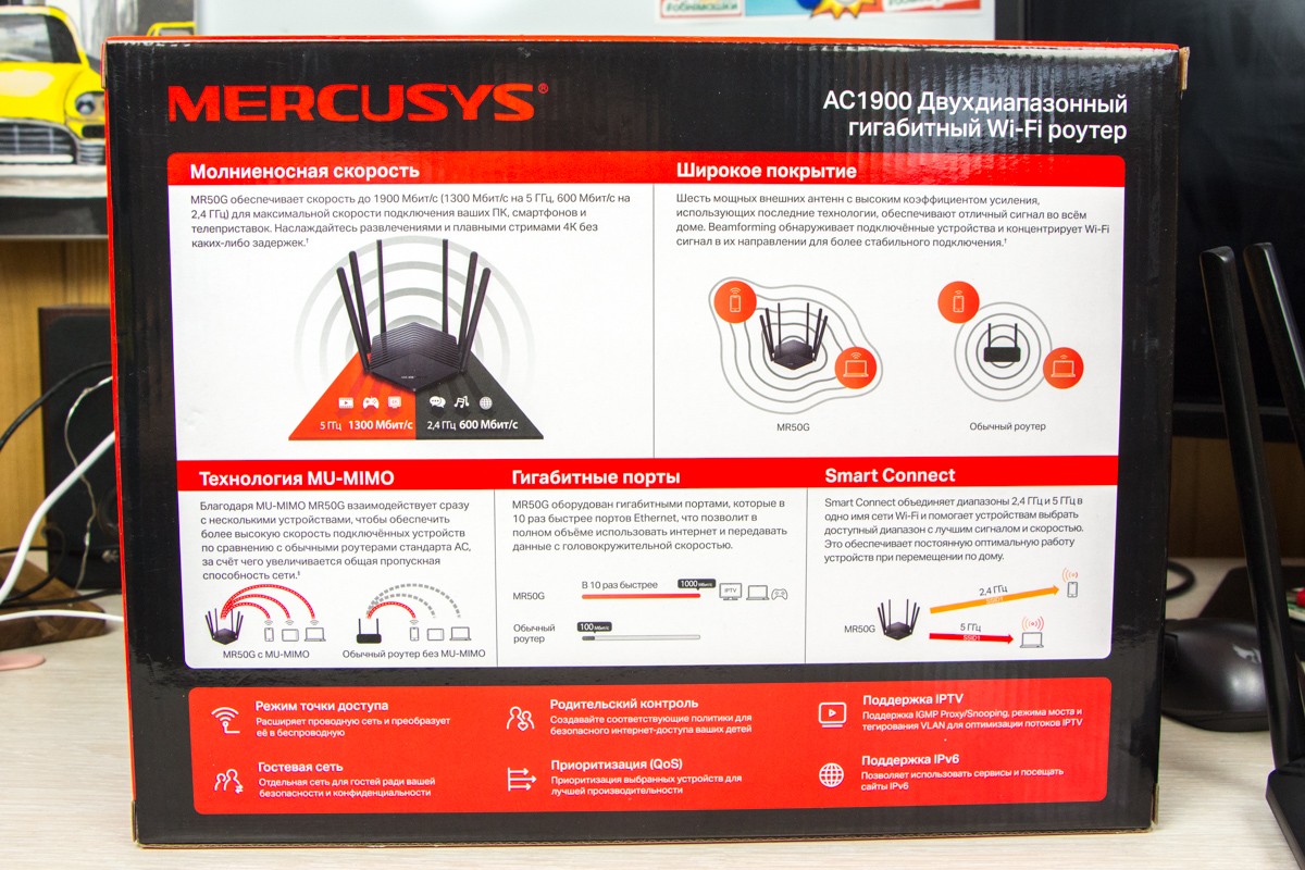 Обзор Mercusys MR50G: быстрый Wi-Fi роутер в бюджетном сегментеMercusys MR50G – недорогой и быстрый роутер. Он заинтересует, если подбираете устройство с поддержкой стандарта 801.11ac, технологией Smart Connect, MU-MIMO, Beamforming, гигабитными WAN/LAN портами и интересным дизайном корпуса. Интерфейс удобен, а вот какие скорости беспроводного обмена данными обеспечивает роутер при проводном подключении 1 Гбит/с к провайдеру узнаете из обзора. Дизайн и корпус Роутер бюджетный, а выглядит стильно. Устройство нельзя повесить на стену, крепления не предусмотрены, но можно поставить столе. Много места не займет, габариты 175.6 x 157.2 x 45 мм. На видном месте, например, рядом с игровой приставкой, он будет смотреться уместно. Для разнообразия добавили глянца. Он в виде ломаной линии ступеньками пересекает корпус по горизонтали. Смотрится современно. По периметру устройства размещено 6 больших антенн. На эргономику размещения роутера они не влияют, так как позволяют наклонять себя в двух плоскостях. Качество сборки на уровне с лидерами рынка. Аппаратная начинка Внутри Mercusys MR50G 1-ядерный чипсет с двумя потоками MediaTek TP1900BN, который работает на частоте 1,2 ГГц. Выбранные компоненты позволяют роутеру одновременно работать минимум с 10 устройствами. Пробовали подключить приставку, смарт-ТВ, два смартфона, ноутбук и планшет. Никто из клиентов не жаловался на перебои со связью или медленную загрузку сайтов. За передачу данных отвечают чипы MT7761N (802.11n) и MT7762N (802.11ac). Их заявленный предел по скорости - 600 Мбит/с в диапазоне 2,4 ГГц и 1300 Мбит/с в диапазоне 5 ГГц. Возможности Указанная производителем в характеристиках скорость подкрепляется технологиями, которые поддерживает роутер. Их список у Mercusys MR50G достаточный: