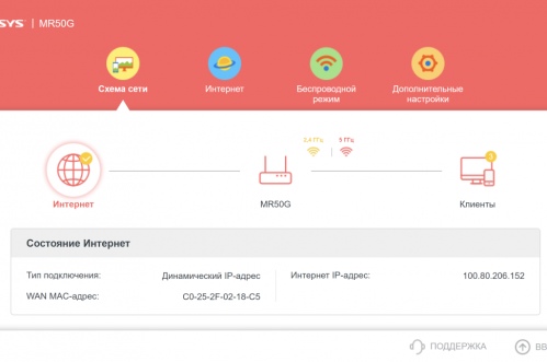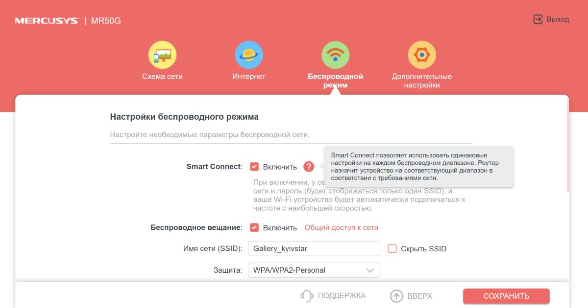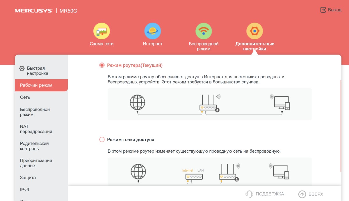 Как видите, даже для диапазона 2.4 ГГц скорость более чем хороша. При прямой видимости маршрутизатор обеспечивает почти “идеальные” результаты на которые способен сам, но с оглядкой на ограничения клиентов - смартфона и ноутбука. Падения скорости при отдалении от MR50G не избежать. Плюс учтите, что помехи создают и соседи со своим парком беспроводных маршрутизаторов. Понравилось, что оба диапазона обеспечивают стабильное соединение, которого хватает и фильм онлайн посмотреть, и поработать, и поиграть. Настройка О том, как подготовить роутер к работе не видим смысла много писать. Если Ви просто подключите к нему кабель провайдера, то сразу же сможете пользоваться беспроводной сетью по умолчанию. Данные для подключения к ней производитель указал на наклейке с серийным номером устройства. Она наклеена внизу. Хотите углубиться в детали - заходите в расширенные настройки через веб интерфейс. Меню удобно структурировано и в нем сложно запутаться. Тем более повсюду предусмотрены подсказки. Важно то, что вы можете указать режим работы устройства: