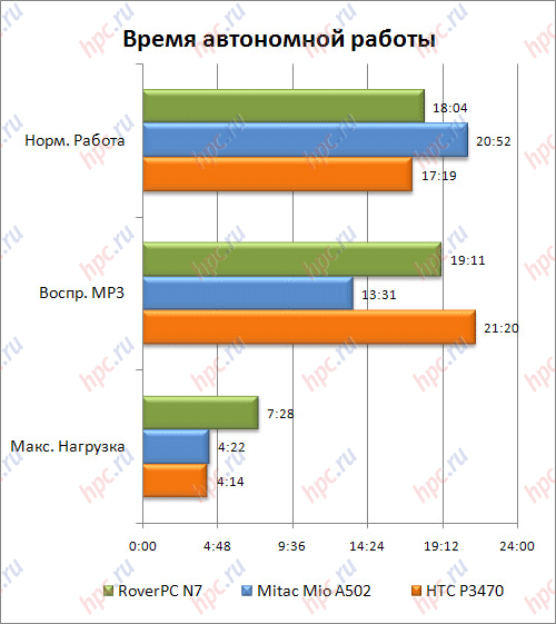 Что касается записи видео, то здесь ничего хорошего сказать нельзя. Качество довольно посредственное, а максимальное разрешение составляет 176х144 пикселя. Этого мало даже для нормального просмотра снятых роликов на экране коммуникатора. Для записи доступно два формата – 3GP и MP4. Кроме того, можно включать/выключать запись звука при видеосъемке. Звук при записи низкого качества, гораздо более низкого, чем диктофонные звуковые записи. Объяснить это можно, разве что, особенностями формата, в котором звук сильно сжимается. Еще один интересный момент – автоматическая фокусировка. Она возможно не только перед началом съемки, но и в процессе. Для этого нужно «притапливать» кнопку камеры, когда необходимо. Полное ее нажатие остановит запись. Ну а ниже вы видите несколько примеров роликов, снятых вcтроенной камерой Mitac Mio A502. Время автономной работыЕмкость аккумуляторной батареи из комплекта не вселяет особых надежд. 1050 мАч – это меньше среднестатистической емкости для WM-устройств. Так что к тестированию времени автономной работы мы подходили с известным скептицизмом. Схема по-прежнему остается без изменений, взглянем на результаты. Режим максимальной нагрузки. Яркость подсветки выставлена на максимум, громкость динамика тоже, включен Bluetooth и GPS-модуль, а через Windows Media Player в цикле в цикле воспроизводится "тяжелый" видеоролик. Время автономной работы в этом режиме составило 4 часа 22 минуты. Нормальная работа. Все беспроводные модули отключены. Яркость подсветки установлена на второе по счету деление. На коммуникаторе запущено чтение текста в программе Haali Reader с автоматической прокруткой. Время работы составило 20 часов 52 минута. Воспроизведение МР3. Беспроводные модули и подсветка экрана выключены. Прослушивание музыки через наушники на максимальной громкости. Использовался Windows Media Player и файлы с битрейтом 192 kbps. Время работы – 13 часов 31 минута. Оказалось, что сомнения были напрасными. Mitac Mio A502 продемотсрировал неплохие результаты, выше среднего. А данная диаграмма поможет составить представление, насколько это хорошо на фоне ближайших конкурентов.