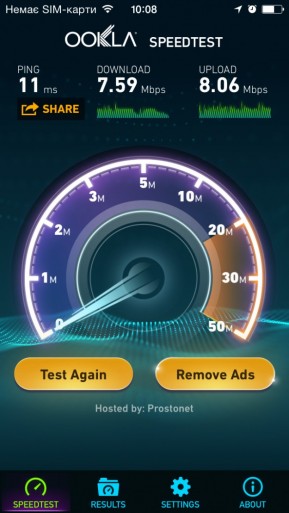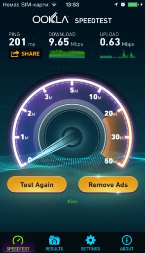 Дисплей и автономностьДисплей TP-LINK M7350, как уже упоминалось ранее, жидкокристаллический монохромный c диагональю 1.4 дюйма. Во время работы на нем отображается следующая информация: название сети оператора, тип соединения и уровень сигнала, уведомление о роуминге, скорость передачи данных, наличие непрочитанных сообщений, уровень заряда батареи и число пользователей Wi-Fi. Главный недостаток экрана тестируемой модели - "слепота" на ярком солнце, а главное преимущество - невысокое энергопотребление. Раз уже зашла речь о потреблении заряда, то заявленное производителем время автономной работы тестируемого маршрутизатора от аккумулятора емкостью 2550 мАч - до 10 часов. На практике же при непрерывном использовании мобильного интернета TP-LINK M7350, обслуживая 1-3 клиентов, может проработать лишь порядка 6 часов, а вот если обращаться к нему только время от времени, то заряда батареи вполне хватит на полный рабочий день. Беспроводные интерфейсыБлокировки на оператора в TP-LINK M7350 нет, можно использовать SIM-карты любого провайдера. Поддерживается работа в сетях 2G EDGE/GPRS/GSM (850/900/1800/1900МГц), 3G WCDMA B1/B8 DC-HSPA+/HSPA/UMTS (900/2100МГц) и FDD-LTE Cat4 B1/B3/B7/B8/B20 (800/900/1800/2100/2600МГц). Скорость передачи данных напрямую зависит от загруженности базовой станции и расстояния до нее. При этом максимальная заявленная производителем скорость получения данных для 3G составляет 42 Мбит/с, а для 4G — 150 Мбит/с (FDD), отправки данных – 7.2 Мбит/с (3G) и 50 Мбит/с (4G). А вот такой результат мы получили на iPhone 5, используя 3G-сеть от сотового оператора Life:) в 20 км от Киева и в самой столице.