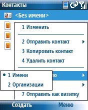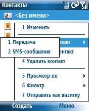 Здесь находится номерная база телефонов абонентов пользователя. Среди настроек этого подпункта доступны следующие возможности: «отправить», «удалить», «копировать» контакт, «отправить как визитку», «сортировать контакты» и другое.