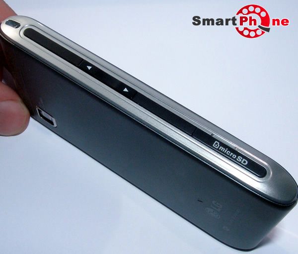 На левой боковой грани имеется клавиша – качелька - регулирования громкости звука, а чуть ниже – слот для расширения карт памяти. Радует тот факт, что производитель расположил слот на одной из боковых граней терминала. К слову, максимальный объем карточек, допустимых для работы в LG GX500 – восемь гигабайт, что, на наш взгляд, не так и мало.