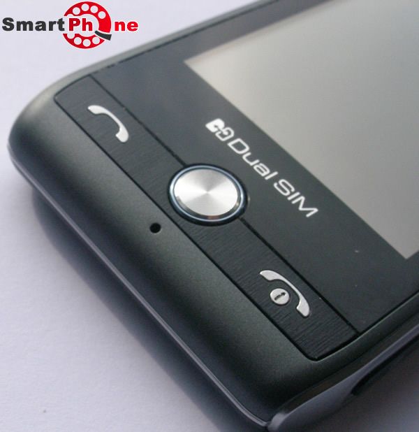 Под дисплеем находится надпись Dual SIM. Здесь также размещены три софт-кнопки. Предназначение клавиш справа и слева от центра традиционное – левая кнопка отвечает за посыл исходящего вызова, а также прием входящего, а правая – за завершение разговора или отклонение входящего вызова. Кнопка, расположенная по центру, вызывает подменю с ярлыками наиболее часто используемых приложений.