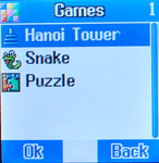 Игры:А вот здесь пользователей ждет разочарование. Телефон не оснащен поддержкой виртуальной Java машины, так что придется довольствоваться тремя встроенными логическими играми: “Ханойская башня”, традиционная “Змейка” и сбор паззла (одна постоянная картинка).