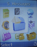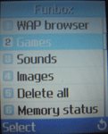 Меню:Меню телефона очень даже необычное: из-за отсутствия больших функциональных возможностей, в основные пункты меню были вынесены настройки звука и сети. Иконки меню динамические, составленные из трех картинок. Вообще-то все пункты и настройки телефона сделаны очень красочно, например, регулировка громкости представлена в виде разноцветных полосок. Состоит меню из девяти пунктов: 1. Меню SIM-карты В принципе большинство названий говорят за себя. Единственно, что стоит уточнить, так это размещение «своего номера» - он находится в настройках, а не, как можно было ожидать, в телефонной книге. Сама же телефонная книга рассчитана на 1000 номеров. А для набора сообщений можно использовать словарь T9.