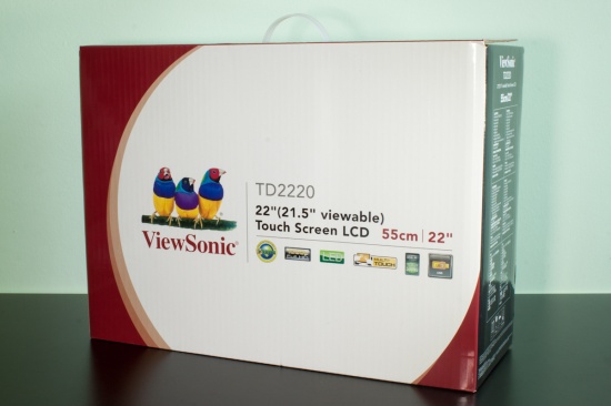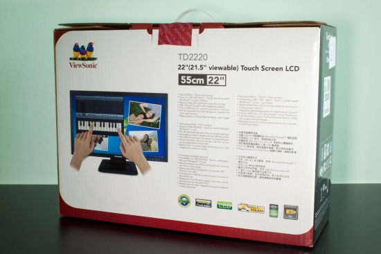 Поставляется ViewSonic TD2220 в достаточно компактной (с учетом того, что мы говорим о 22-дюймовом мониторе) картонной коробке, обладающей, я бы сказал, более информационным дизайном.