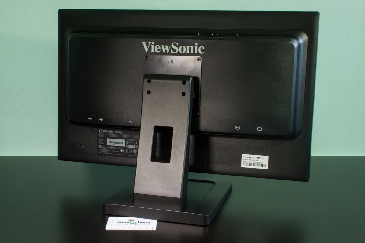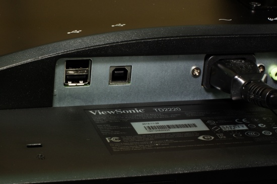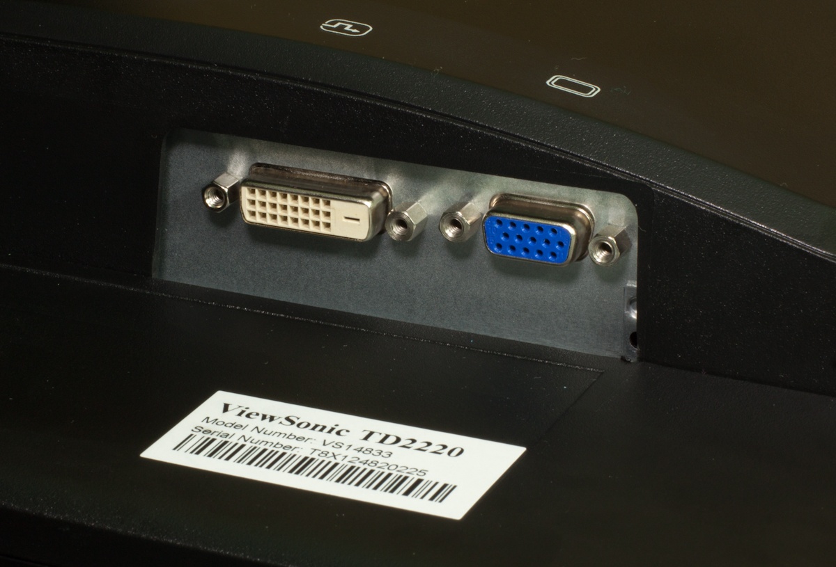 Кроме кнопок и, разумеется, самого дисплея, осматривая переднюю панель, нельзя не отметить небольшую наклейку с несколькими техническими ярлыками. Так производитель «напоминает» о ключевых достоинствах ViewSonic TD2220.